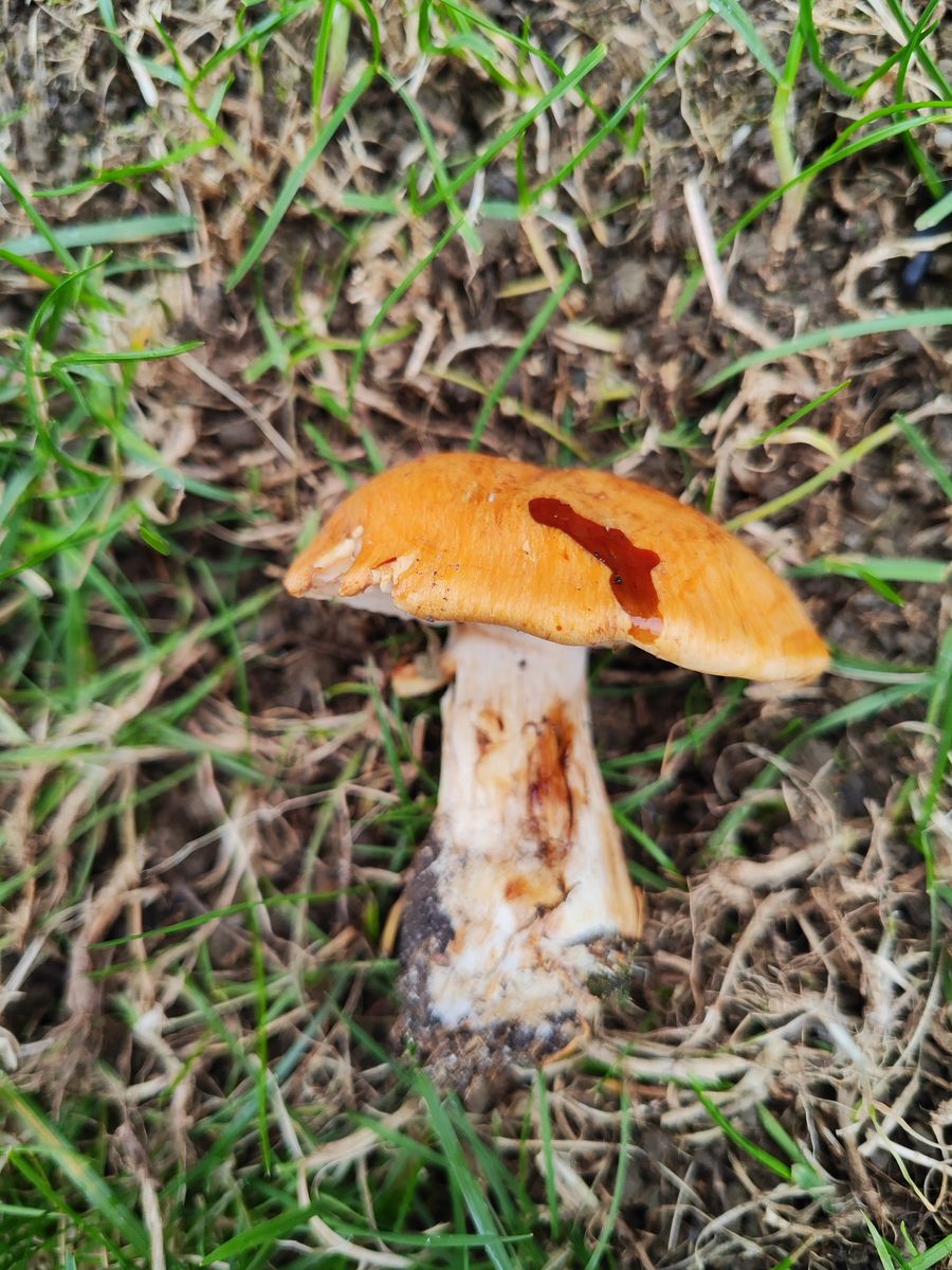 Anfrage 2: Ein hübscher Scheidenstreifling bei Buche und Linde auf Kalk, die Stielbasis war leider zu tief im Kalkboden. Darf ich den Amanita crocea nennen?