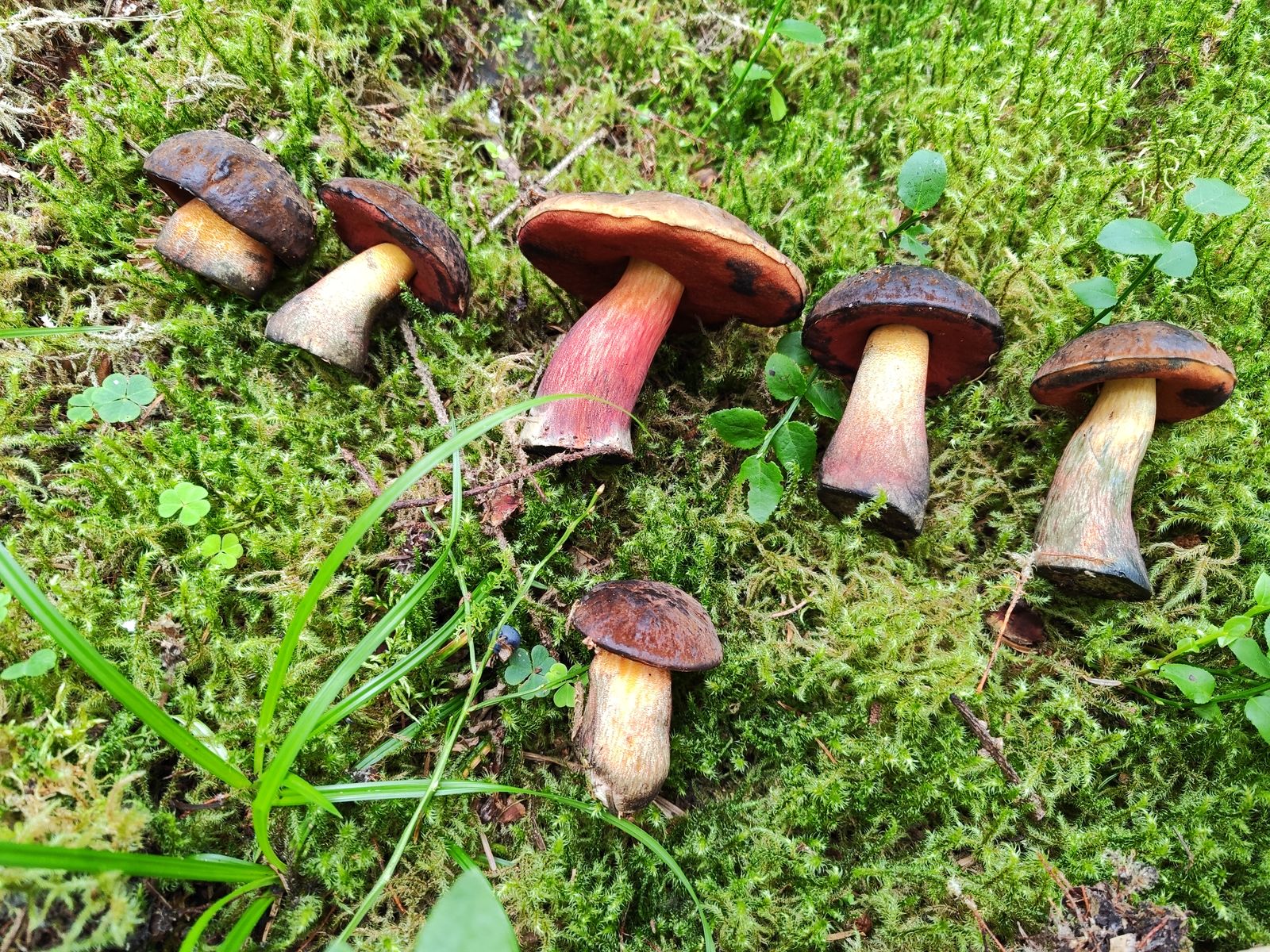5. Caloboletus calopus mit kräftigen Exemplaren im Nadelwald.