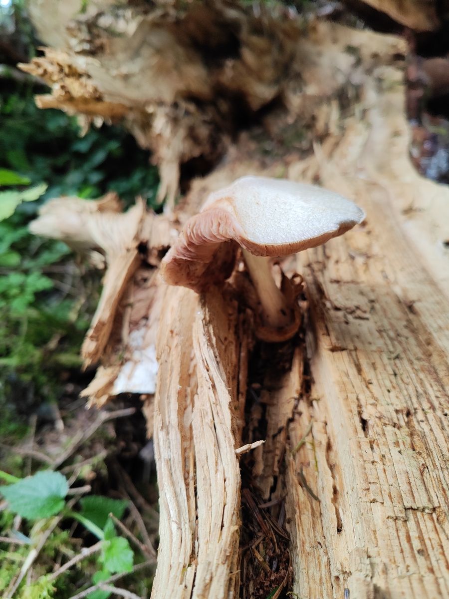 1. Los gehts mit Trompetenpfifferlingen. Eindeutig aus einem Stumpf wachsend (in ca 30cm Höhe) und auch nur dort wachsend. In diesem Wald gibt es wirklich überall Myzelien des Trompetenpfifferlings, aber wirklich nur die an diesem Stamm fruchteten. Klar findet man mal Symbiosepilze scheinbar an Totholz, das eben durchwachsen wurde, C. tubaeformis ist aber wirklich der einzige Symbiosepilz den ich regelmäßig auch in größerer Höhe und mit mehreren Exemplaren an stehenden Stämmen finde.