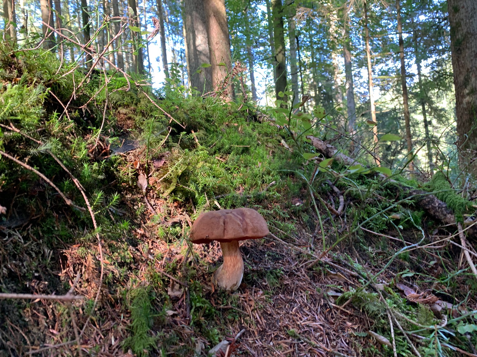 Gestern im Wald gab es an meinen normalen Steinpilzstellen gar nichts, ich glaube da wurden wir auskonkurriert. Nur einige ganz junge Maronen waren zu finden. Auf dem Heimweg fanden wir dann aber einen größeren, versteckt direkt unter einer kleinen Fichte am Wegrand, der zu einer Stelle führte an dem ich nach dem putzen über 1 kg (wurden nachher geteilt) knackfrische Steinpilze (und ein paar Maronen als Bonus) sammeln und ein paar ältere stehen lassen konnte.