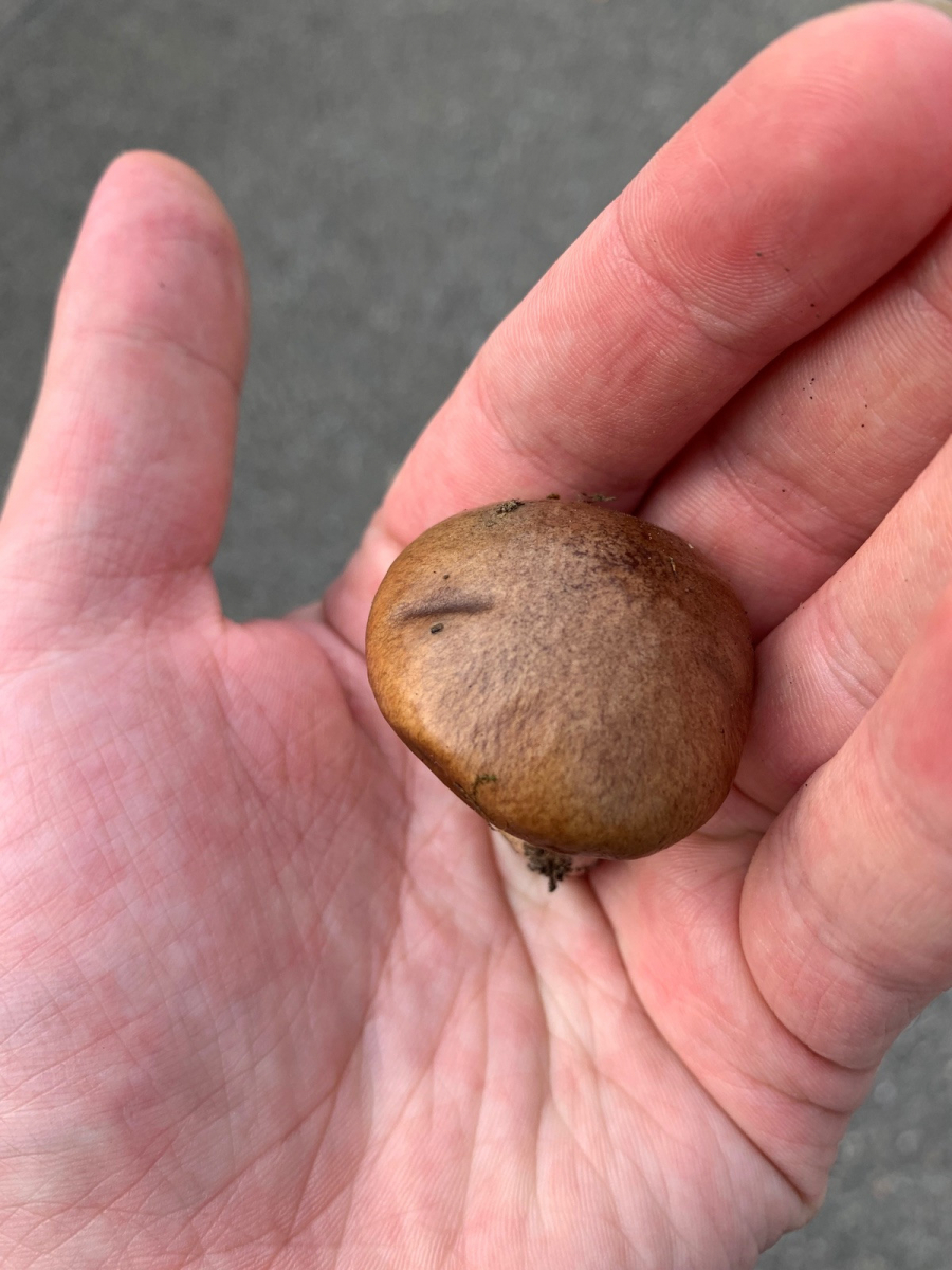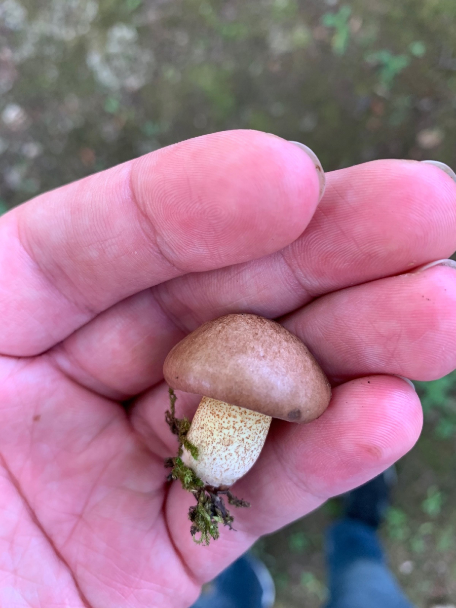 fand ich heute eine Stelle an der ich dachte, hier herrscht absoluter Steinpilzalarm. Dutzende, kugelige , hellbraune Knöpfchen drückten sich im Fichten/Tannenwald aus dem Moos. Dann holte ich aber einen raus und es fühlte sich so gar nicht nach Steinpilz an.