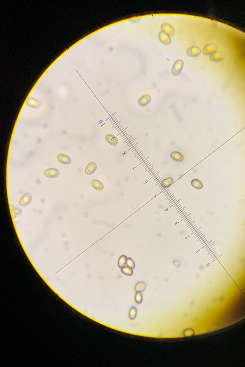 1. Als erstes gab es diesen Röhrling, ich bin mir bei dem nicht sicher ob Rotfuß oder was aus der Ziegenlippen ecke, wie unterscheide ich das denn? Ich habe ihn auch durchgeschnitten, keine Ahnung warum ich davon kein Bild habe, hab den Pilz zwar noch, aber ist jetzt zu eingetrocknet. Der Schnitt war im Stiel rötlich, im Hutfleisch auch schwach bläulich, die Röhren blauen auf Druck. Ich klatsch die Sporen mal mit dran, vielleicht hilfts, aber mein Mikroskopierkurs steht noch aus (Vergrößerung x1000).