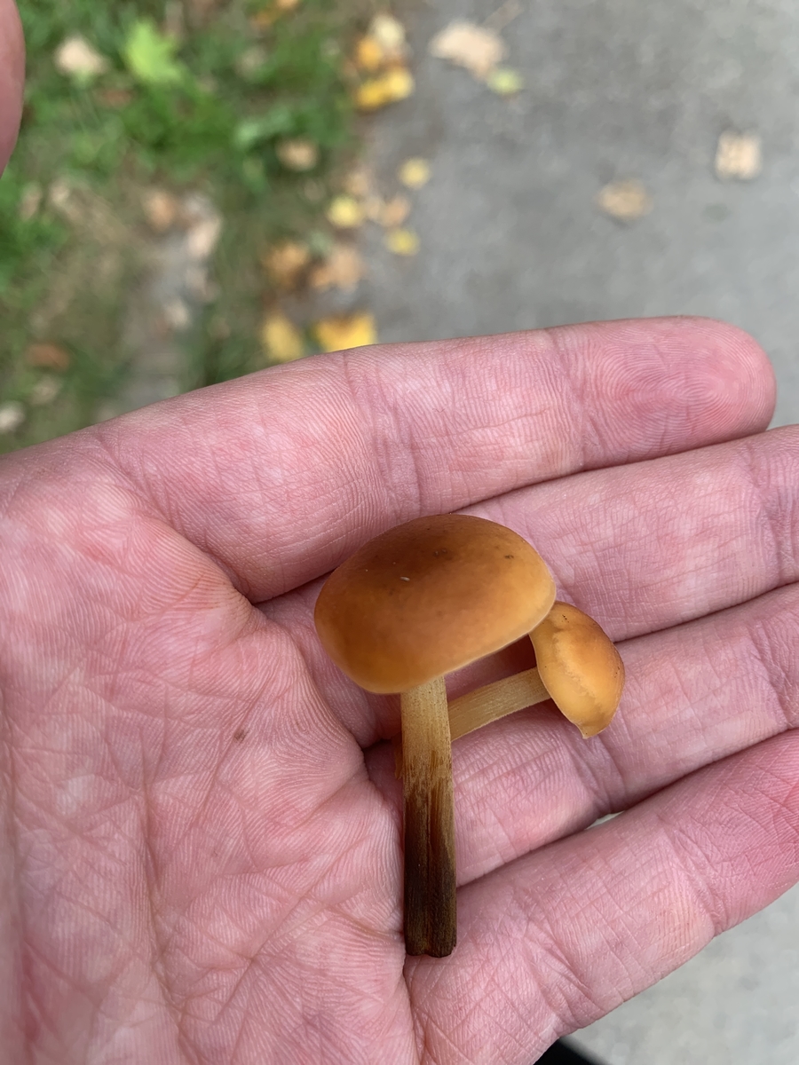 5. Der hier wuchs nicht auf der Wiese, sondern am Wegrand am Laubwald, von oben ein wenig wie der Nelkenschwindling aber mit dunklen Lamellen.