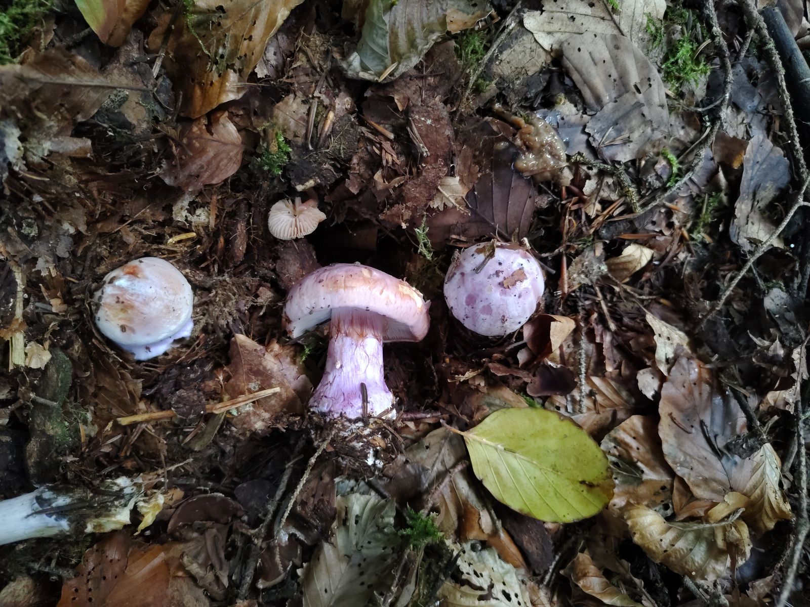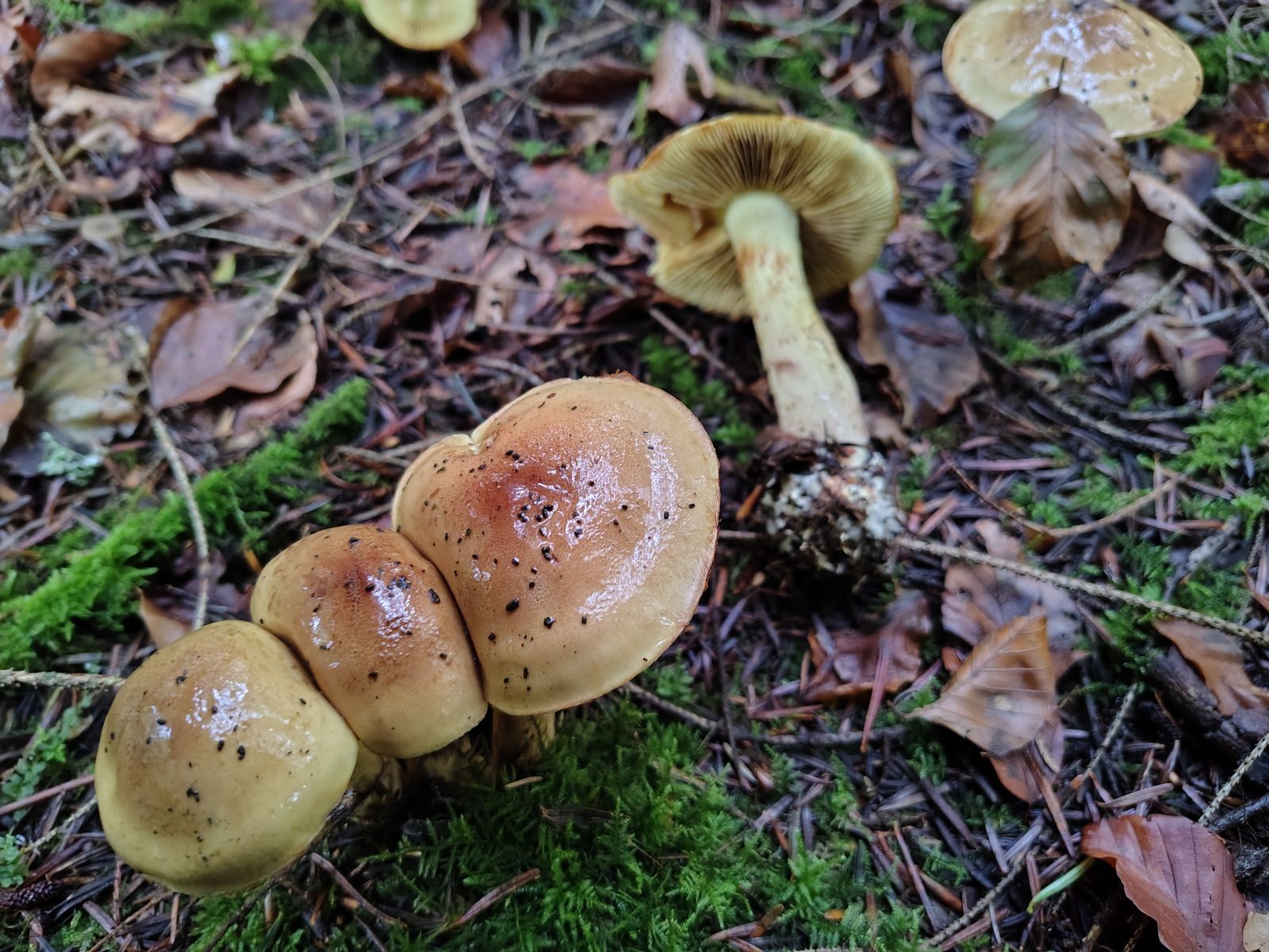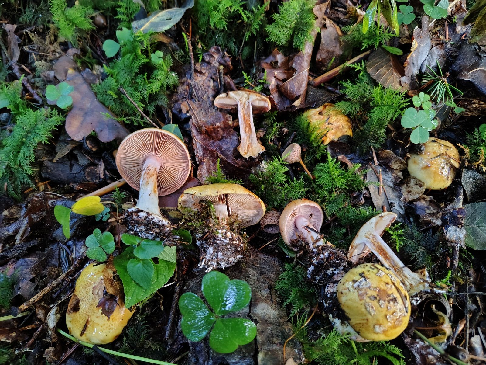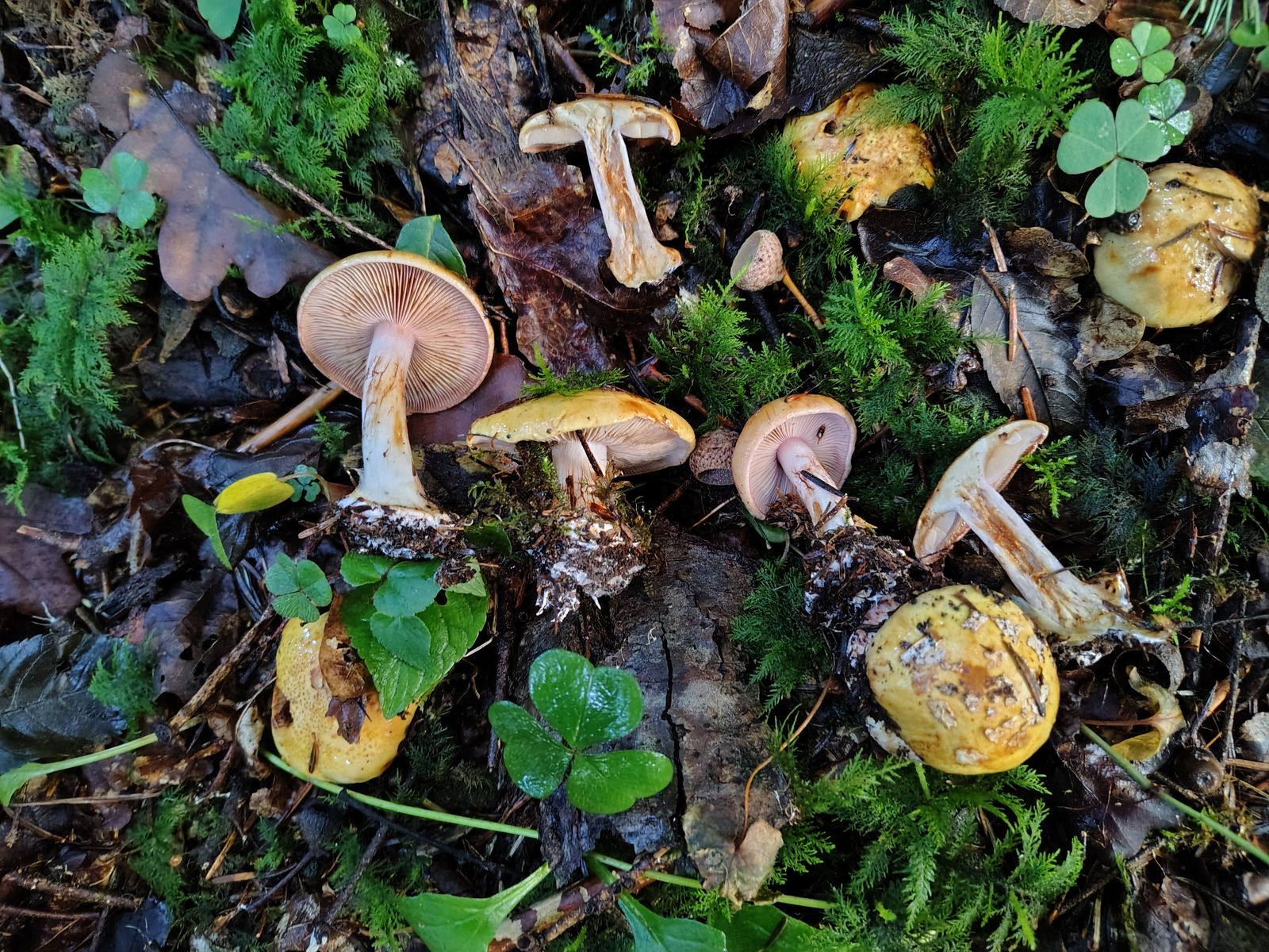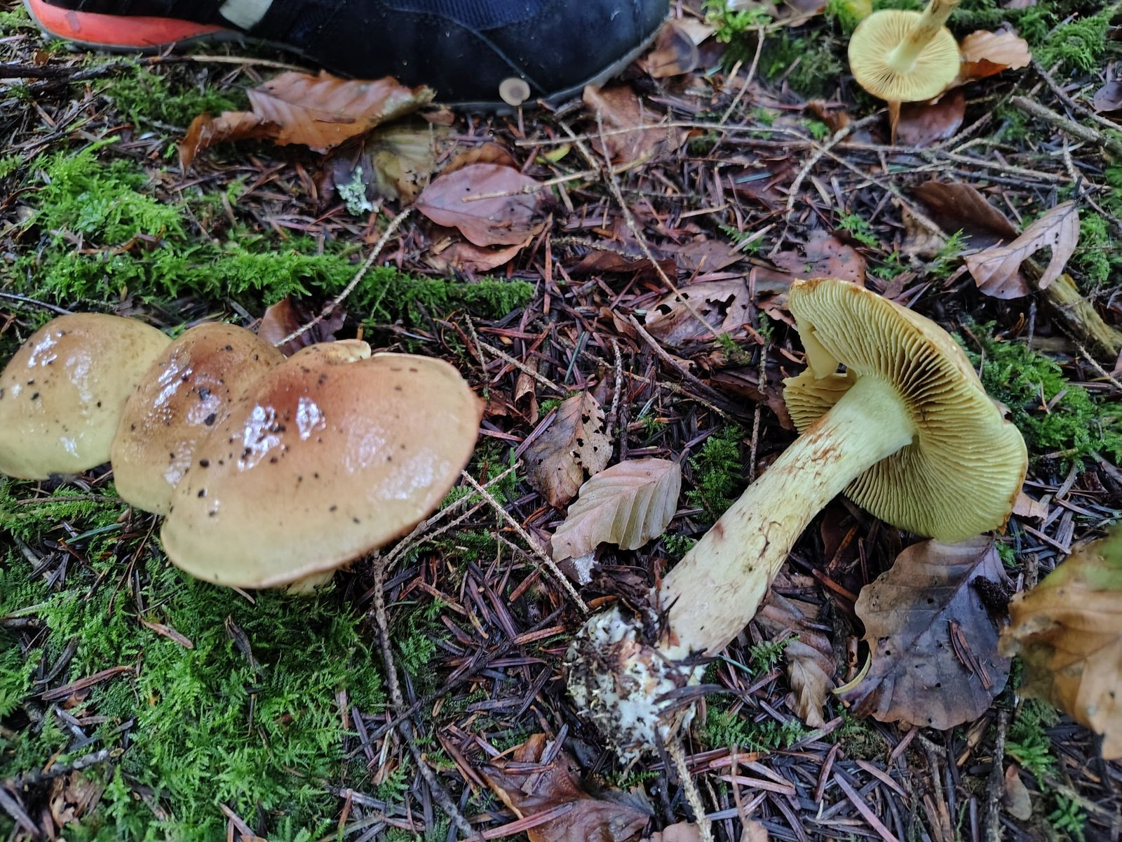5. So. Ich denke einer aber eventuell auch mehrere herrliche Calochroi. Bei uralten Tannen, jungen Fichten und einer 5m Buche auf kräftigem Kalkboden ein riesiges Myzel dieser Art mit bestimmt 40 Fruchtkörpern. Erstmal die volle Kollektion: