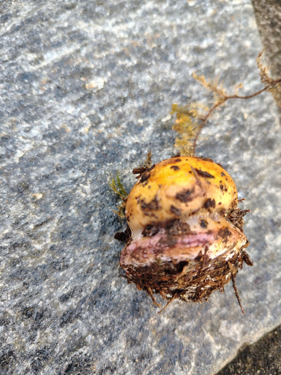 6. Mitten unter dieser Gruppe wuchs übrigens dieser Kandidat, von oben ähnlich aber mit gelbem Stiel und undeutlicher Knolle. Auch KOH negativ