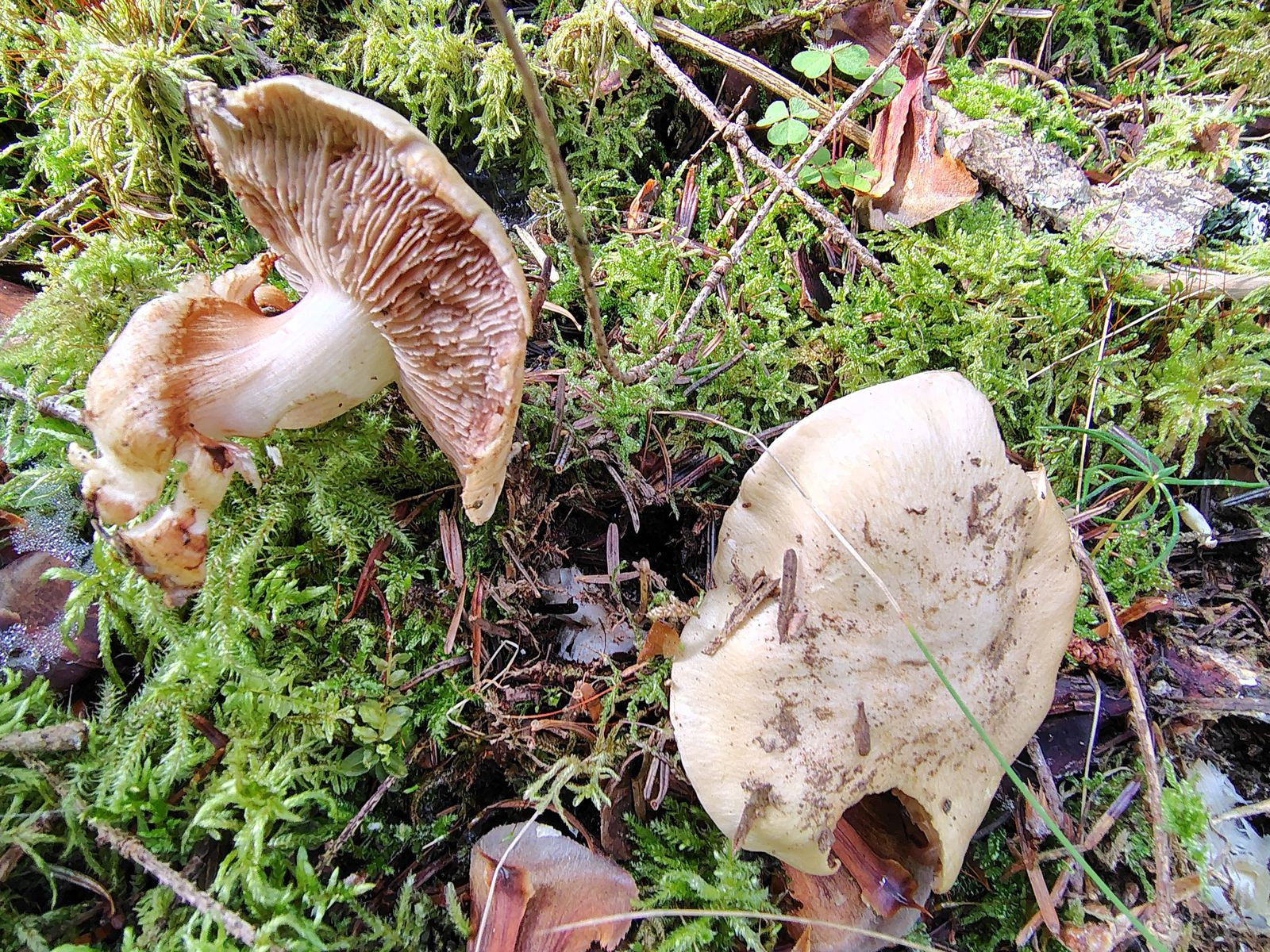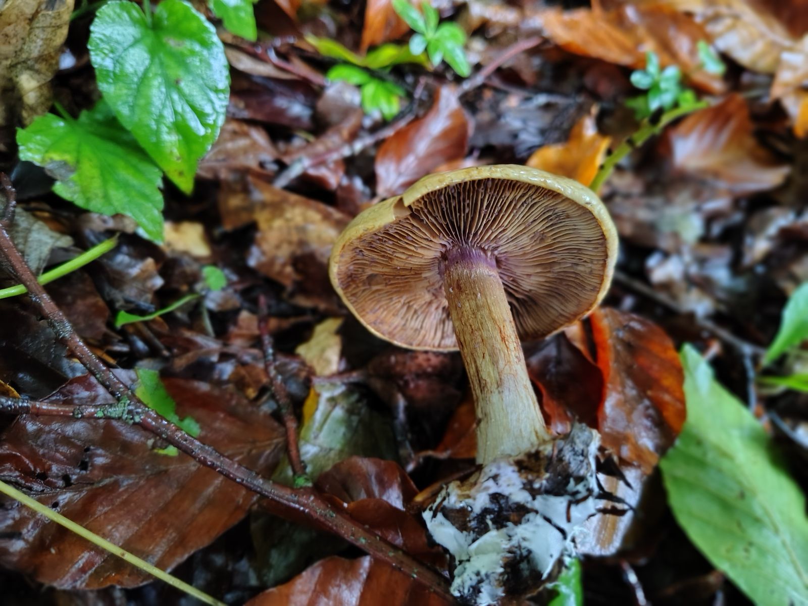 Ebenfalls reiner Nadelwald, viel Violett am Stiel und den Lamellen. Olivfaseriger Hut, gerandete Knolle. KOH überall negativ. Sah bisschen aus wie C. magicus im Nadelwald. Extrem auffällig war allerdings der absolut unverkennbare Mehlgeruch und -geschmack. Gar keine Ahnung wo hin damit, ich finde nur C. dionysae. Da Cortinarius aber neulich nach einer Geschmacksprobe nach Mehl gefragt hat, denke ich, dass es da was geben muss?