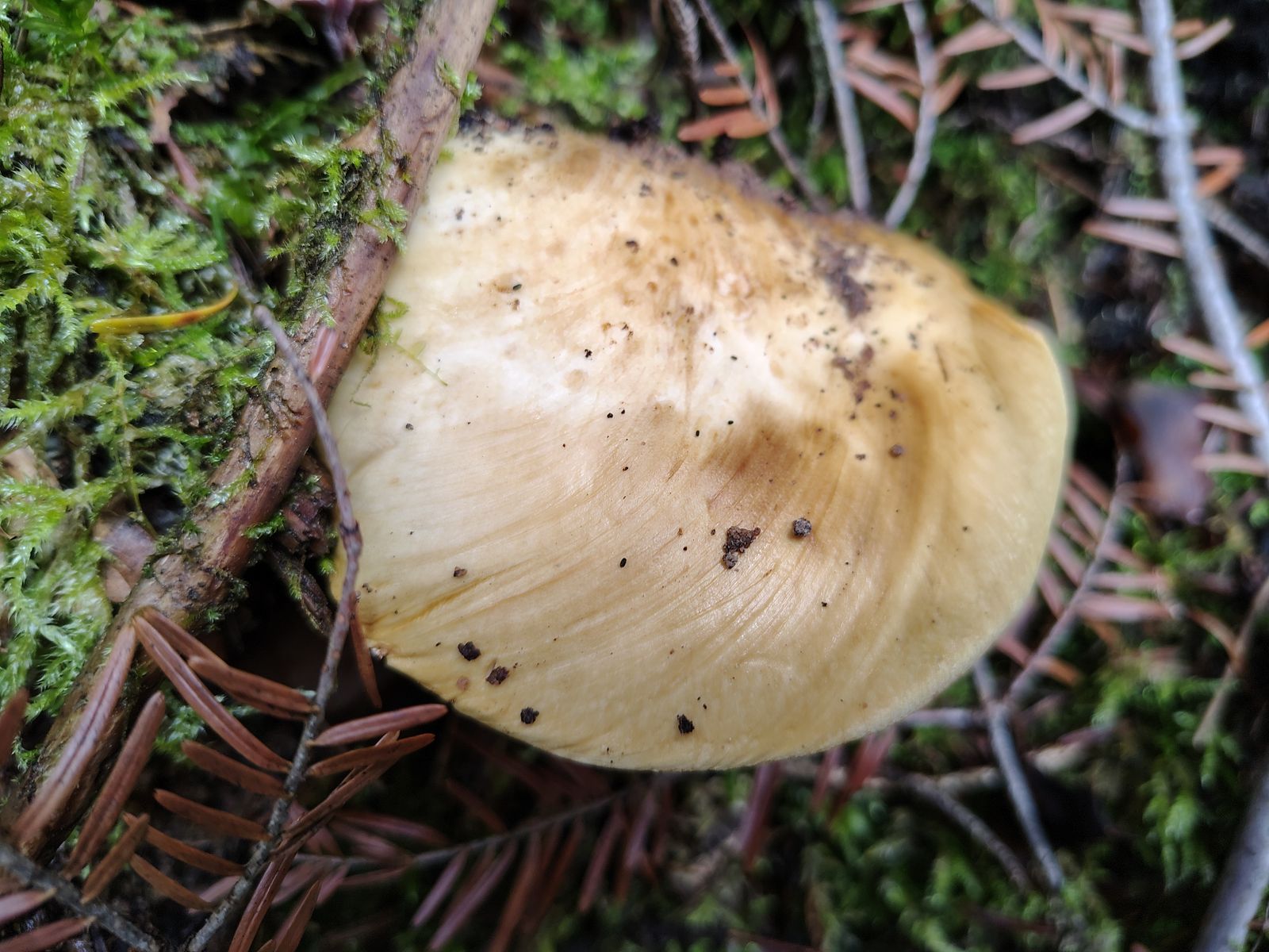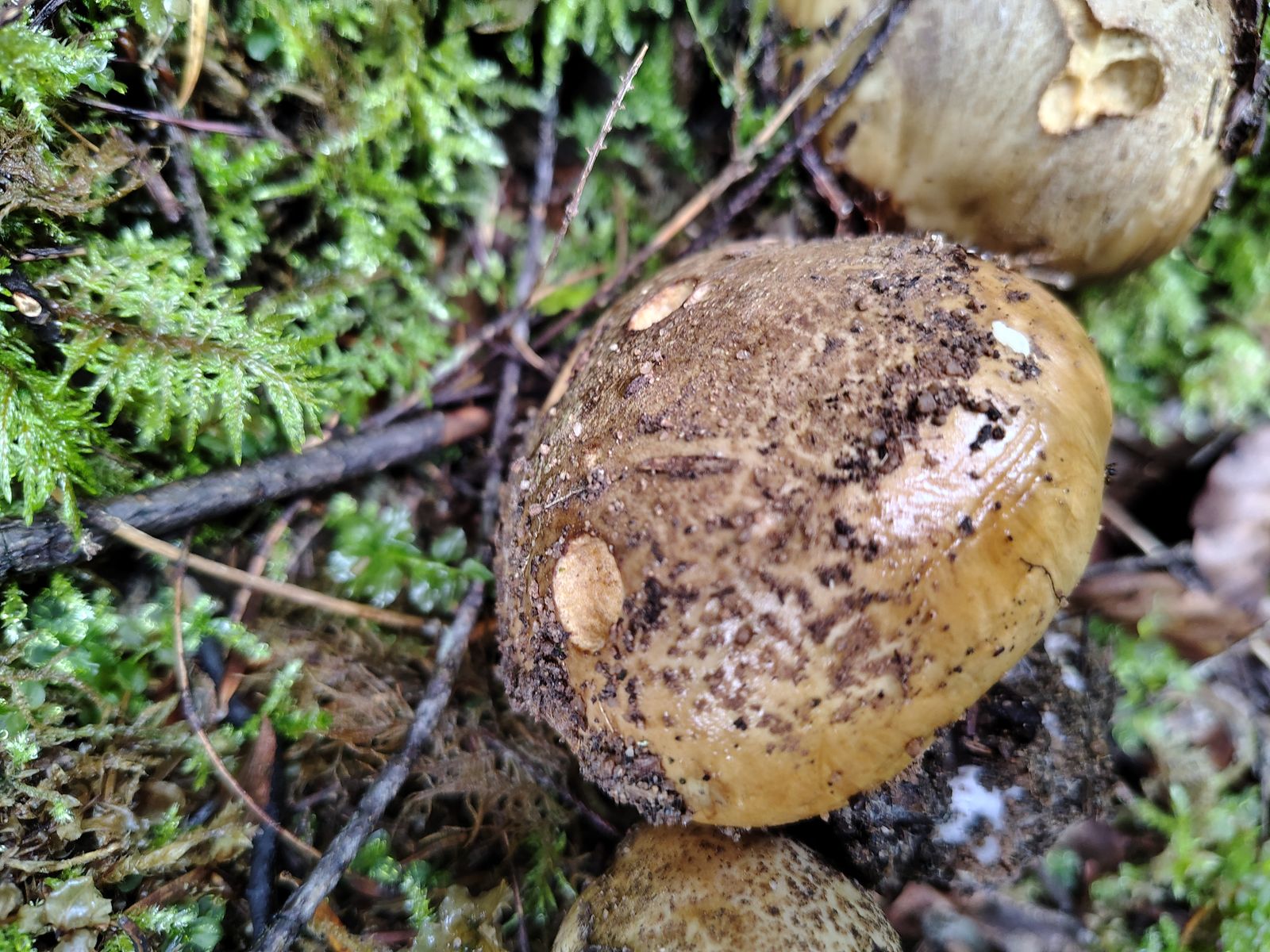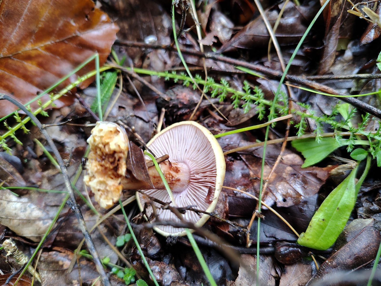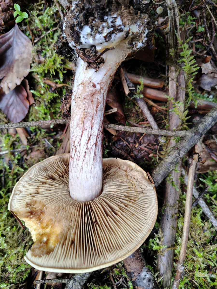 6. So und jetzt gehts los. Ein Einzelexemlar im reinen Nadelwald bei dem ich gerne eine positive KOH Reaktion gehabt hätte aber Pustekuchen; überall völlig negativ. Bei den Farben allerhöchstens ein minimaler Violettschimmer außen am Stiel und merkwürdige Milchkaffeefarbene Schlieren auf dem Hut. Bei dem habe ich überhaupt keine Ahnung wo überhaupt anfangen.7. Ein komisch messingfarbener, stattlicher Klumpfuß im reinen Nadelwald.