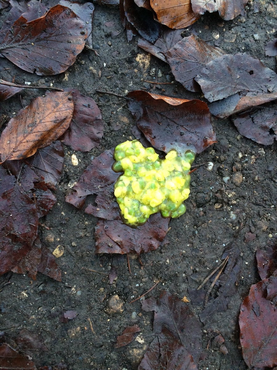 dieses Foto wurde mir zugeschickt, nur dieses eine. Aufgrund der lebhaften Farben ging meine Idee Richtung Schleimpilz, aber was wirklich passendes konnte ich nicht finden. Auch der befragte Jäger hatte keine Idee. Das einzige, was ich noch sagen kann: der Klecks hat sich farblich innerhalb der letzten 24 Stunden nicht verändert. Jemand eine Idee?