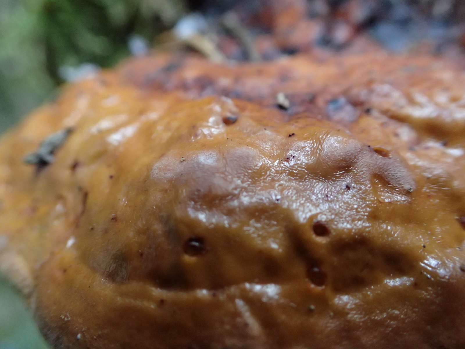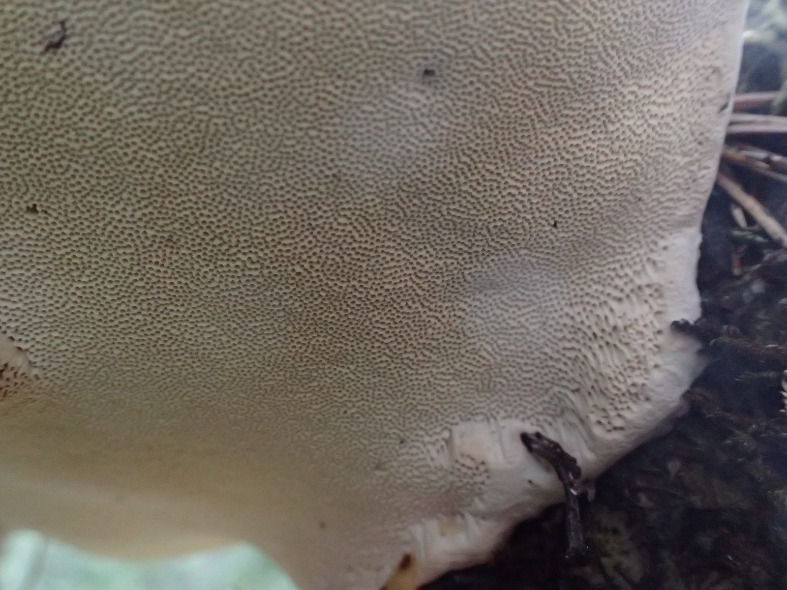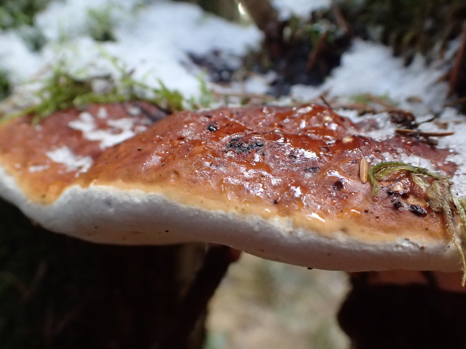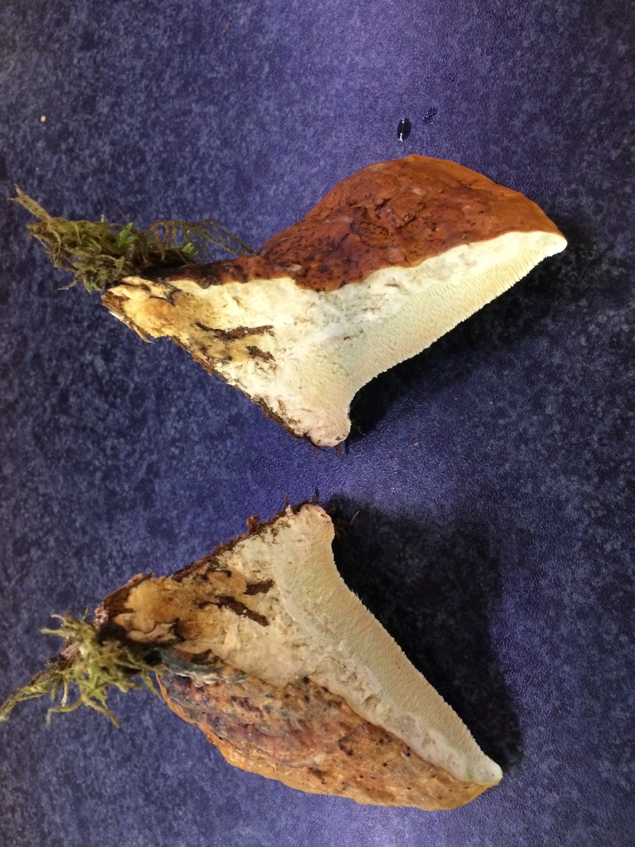 Diesen Fund heute hätte ich spontan bei den Lackporlingen einsortiert. Die Deckschicht lässt sich mit dem Feuerzeug schmelzen, brennt aber nicht. Und die Trama scheint mir zu hell. Geruch sehr ähnlich Birkenporling. Gewachsen auf einem Laubbaum, vermutlich Kirsche.