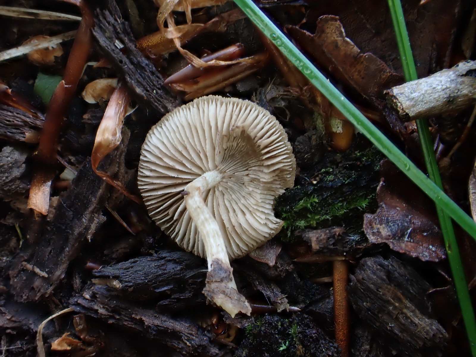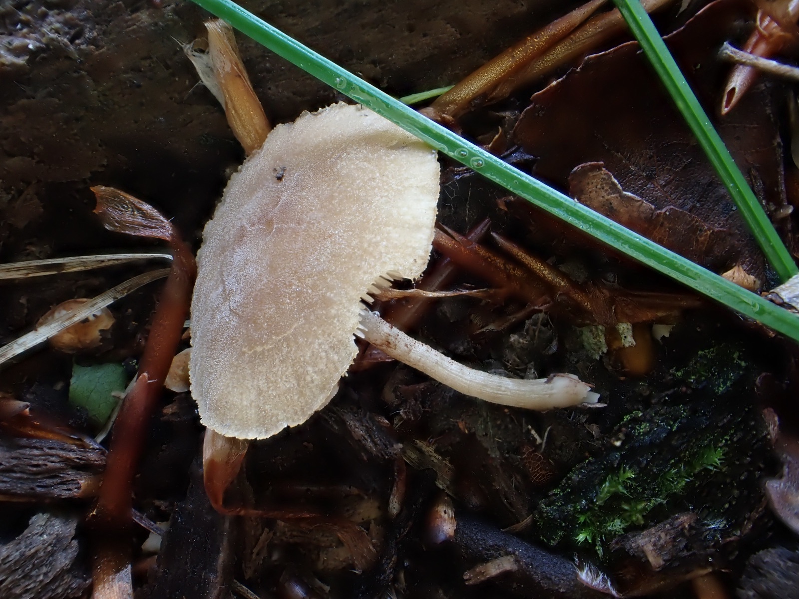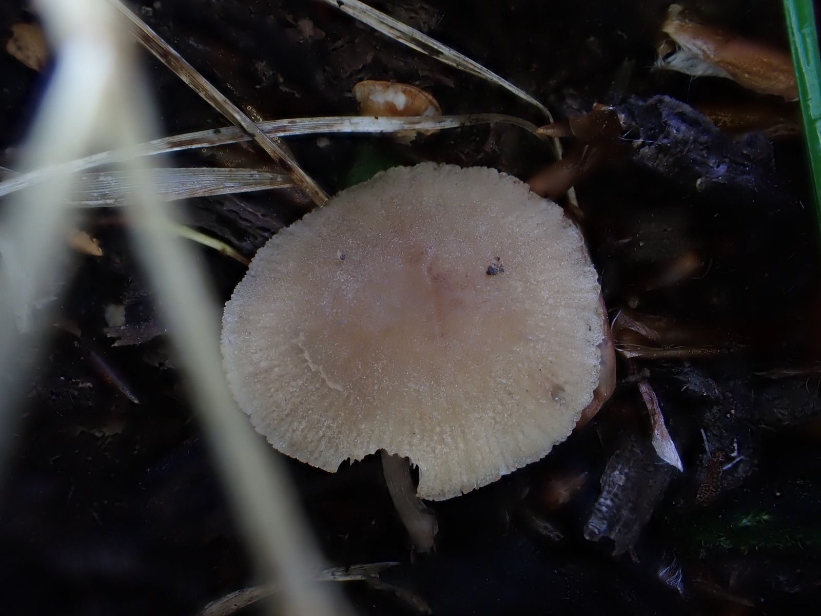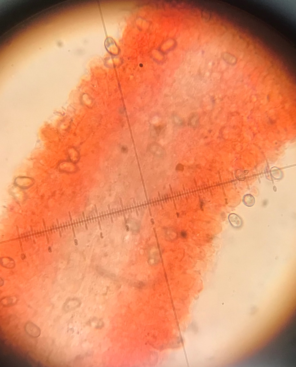 wir haben heute in einem Moorkiefernwald an einer stehenden Birke in ca. 1,5 m Höhe diese zwei Fruchtkörper eines Dachpilzes gefunden. Ungewöhnliche Farbe und die Huthaut ist deutlich radialfaserig, aber eher wildlederartig-samtig, nicht glatt, speckig. Unterm Mikroskop nur liegende Hyphen, einige leicht hochstehend, keine Pileozystiden erkennbar.