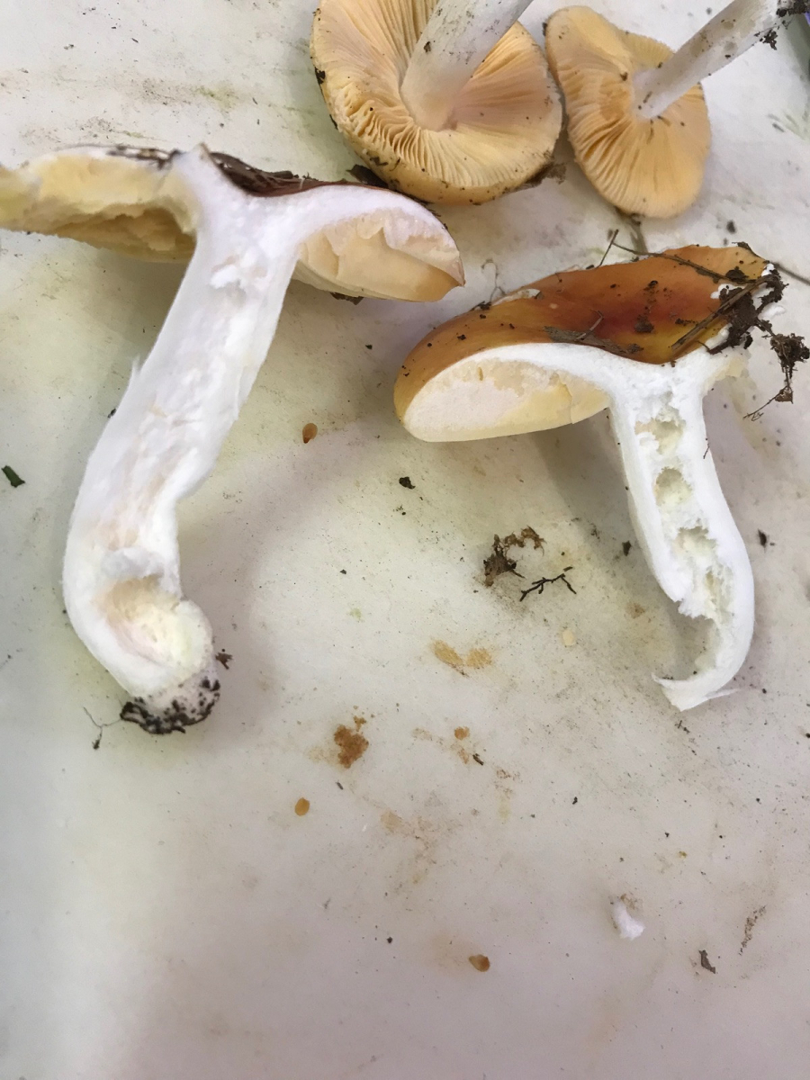 also L. ligyotus kann das mMn nicht sein, den kenn ich viel schlanker, und durch die geriefte Stielspitze und den Hutbuckel ist der eigentlich unverwechselbar. Wie wär’s mit L. fuliginosus, zu dem würden die etwas helleren Farben, das weiße Fleisch (hat L. picinus nicht dunkles Fleisch?), der gedrungenere Wuchs und das leichte Röten ganz gut passen. Dome, du müsstest halt mal länger drauf rum kauen, ob der ned hintenraus doch scharf wird.