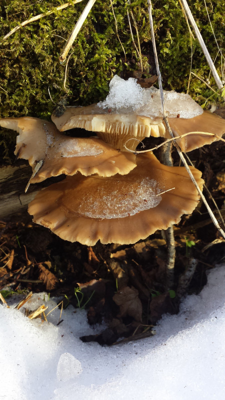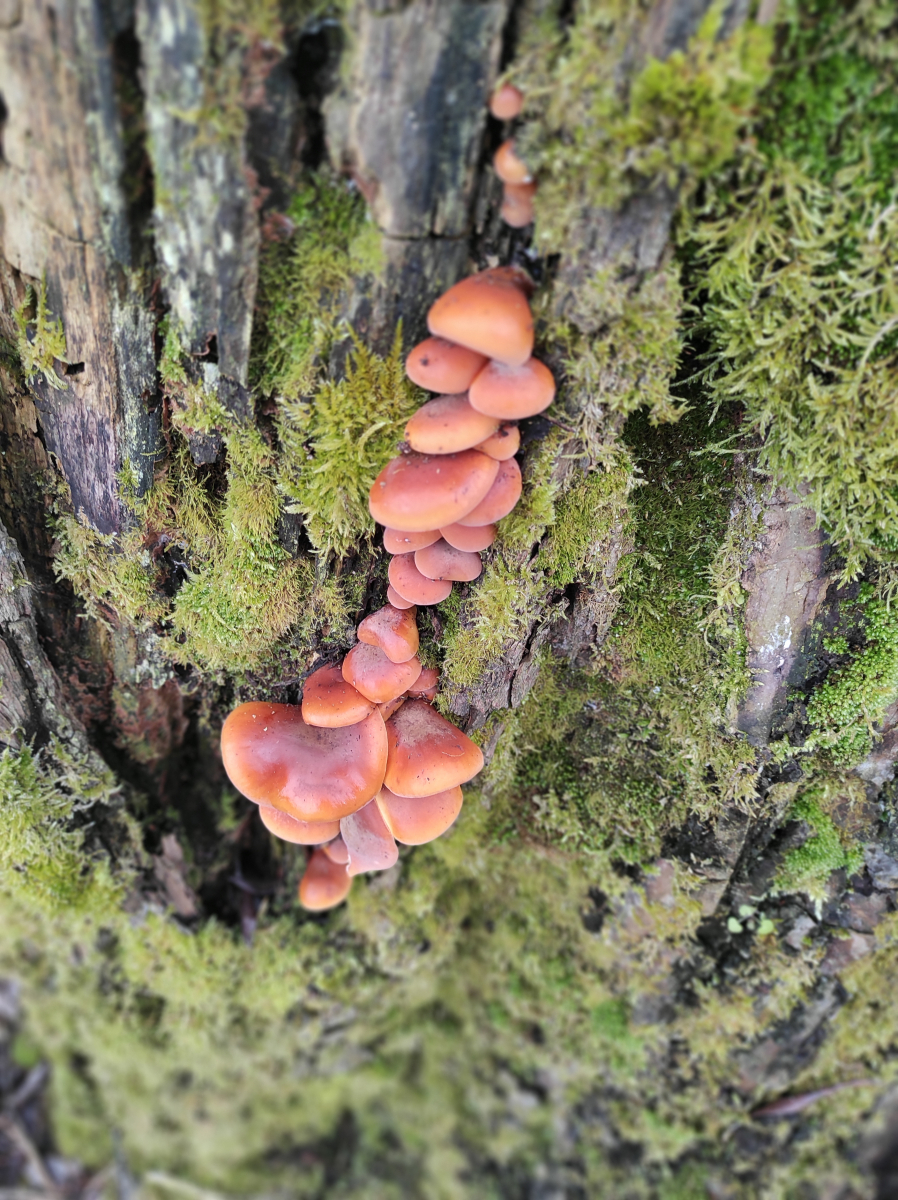 Eigentlich war der erste Gedanke, Samtfußrüblinge gefunden zu haben. Jahreszeit passt. Farbe paßt auch erstmal soweit, aber irgendwie nicht ganz. Fundort: eine alte Weide in Gehöftnähe neben einem Graben - aber die Farbe der Stiele? Außerdem sind die Stiele so dick. Paßt irgendwie nicht... Kanns auch der weißblättrige Samtfußrübling sein? Aber der hätte doch auch einen dunklen Stiel?