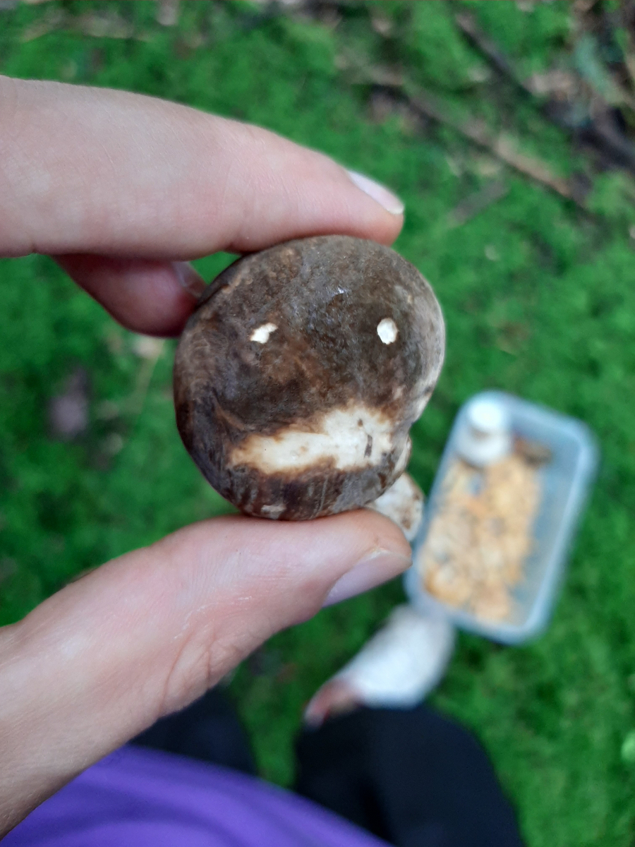 Der Pilz Nummer 2 ist ein Röhrling mit braunen Poren und sehr klein