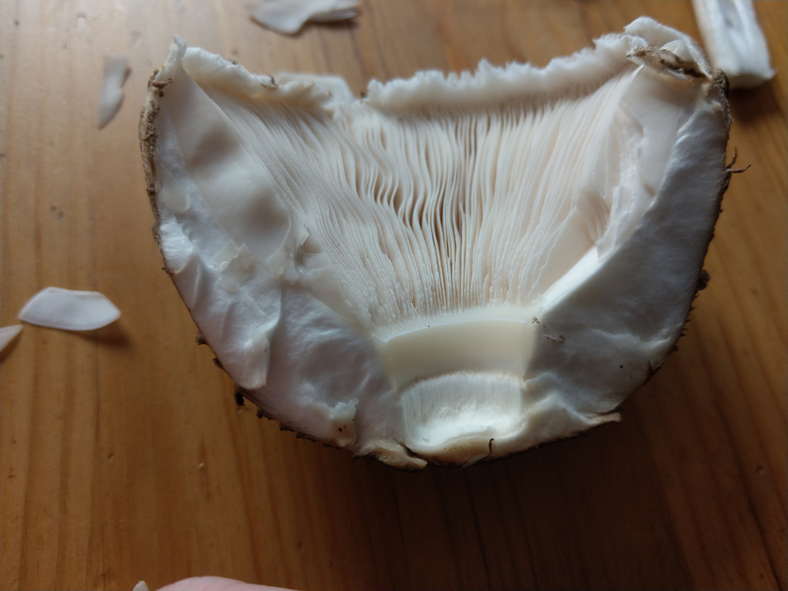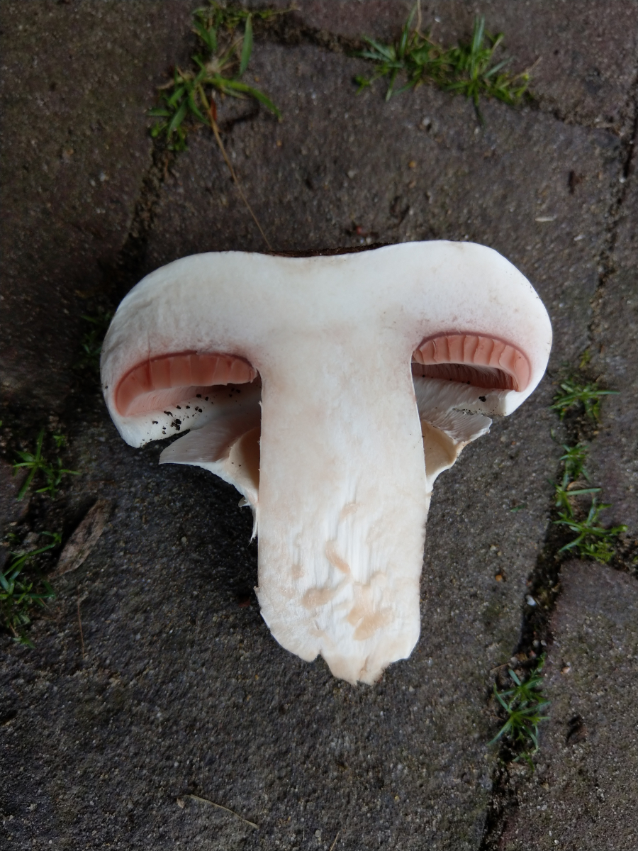 Hut: Durchmesser ca. 7.5 cm, Fleisch & Lamellen weiß, im Anschnitt nicht rötend, Lamellen frei