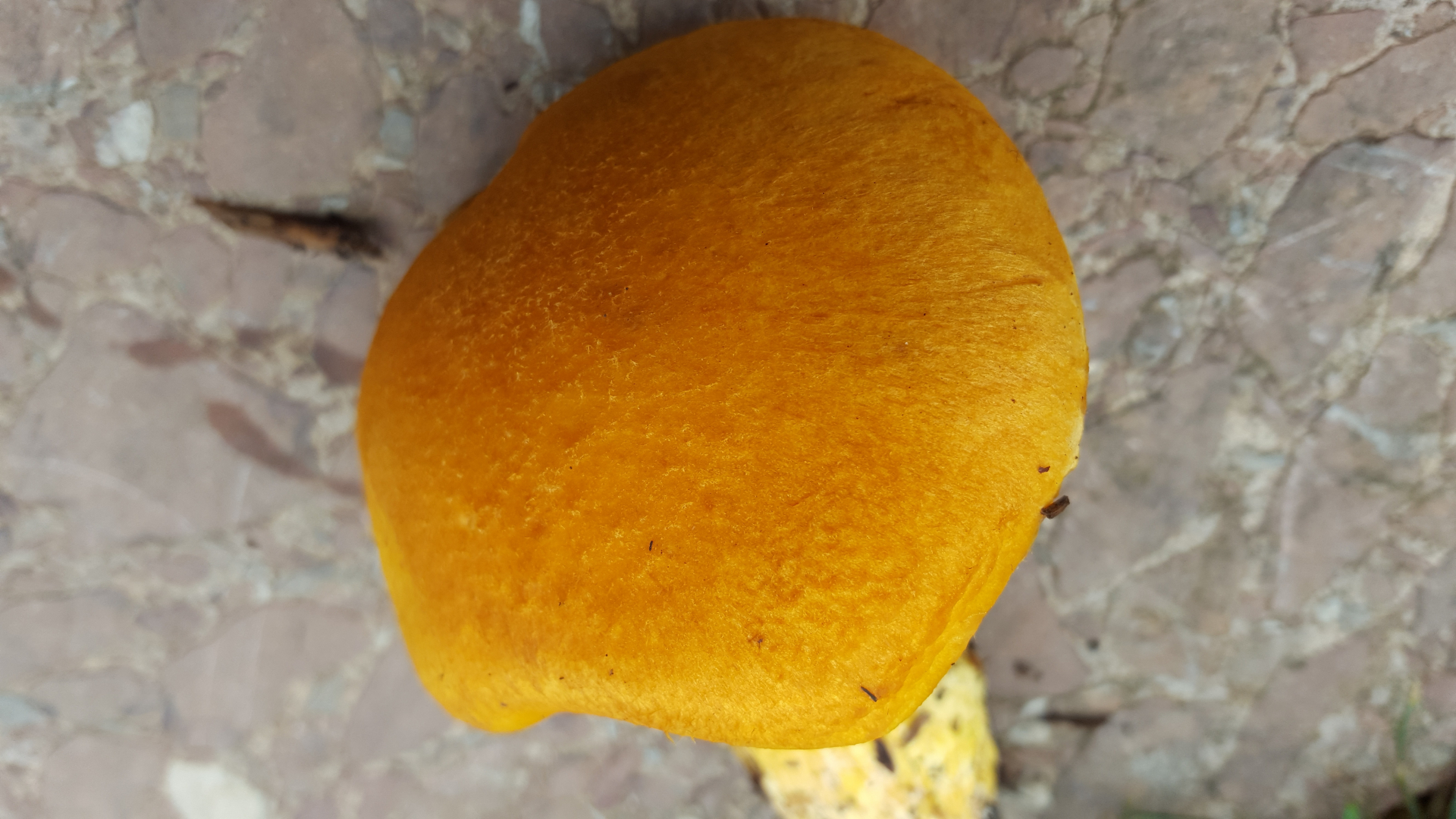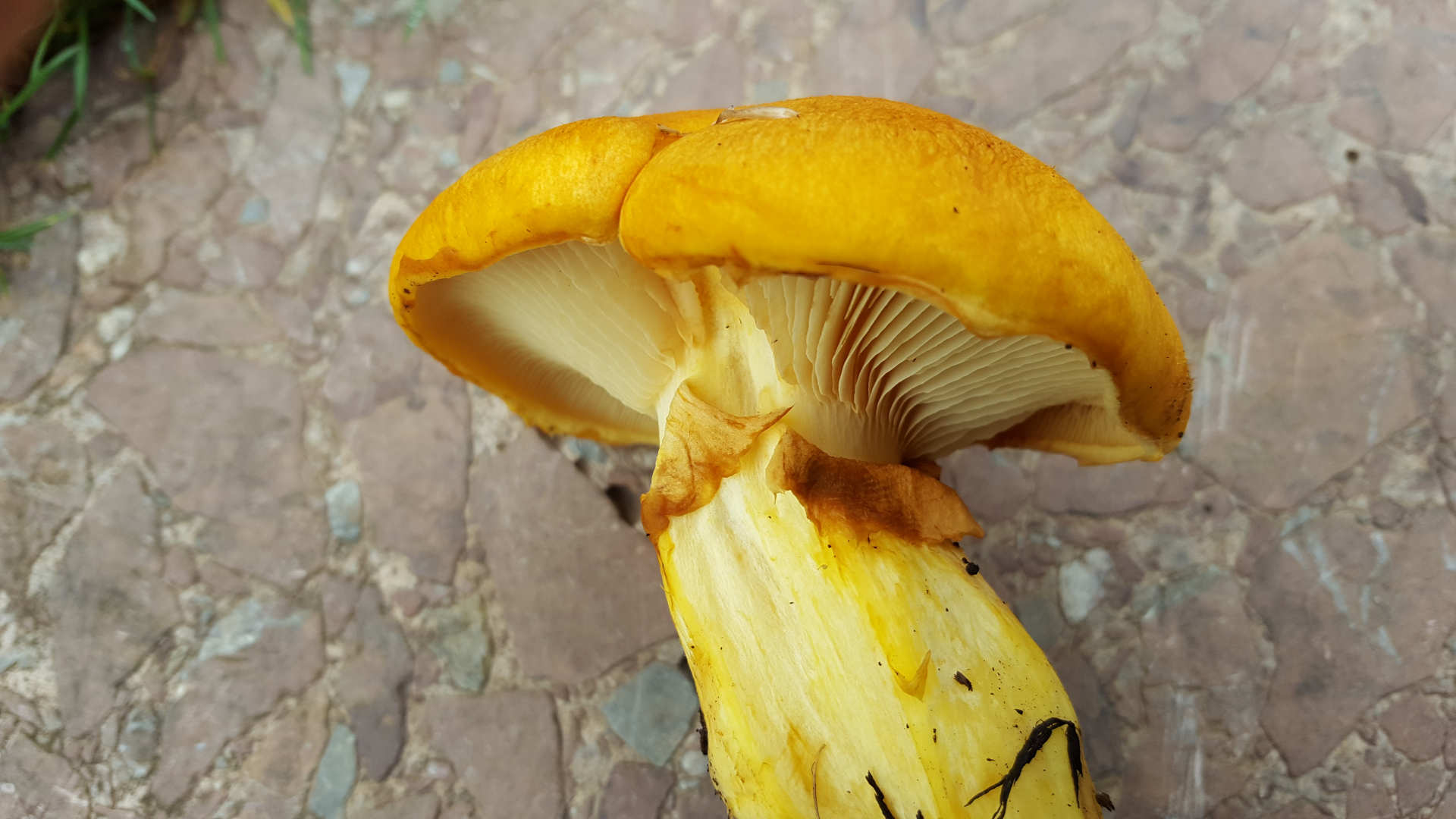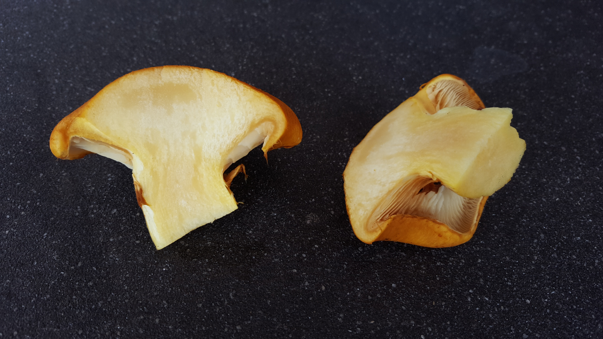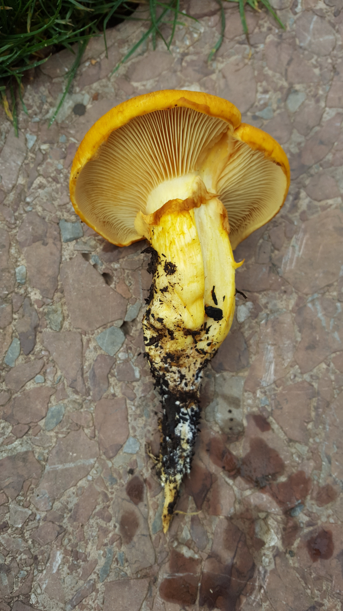 Auf der Unterseite hat er Lamellen. Die Farbe ist saftig gelb-orange. Die Unterseite und das Fleisch ist etwas blasser. Er steht in einer kompakten Gruppe. Die großen Kappen wachsen bis etwa 10cm Durchmesser. Auf dem Bild hat der größte Pilz ca. 6cm Durchmesser. Auch der Stiel wird kräftig. Der Pilz riecht angenehm nach nassem Wald. Der Geschmack ist bitter.