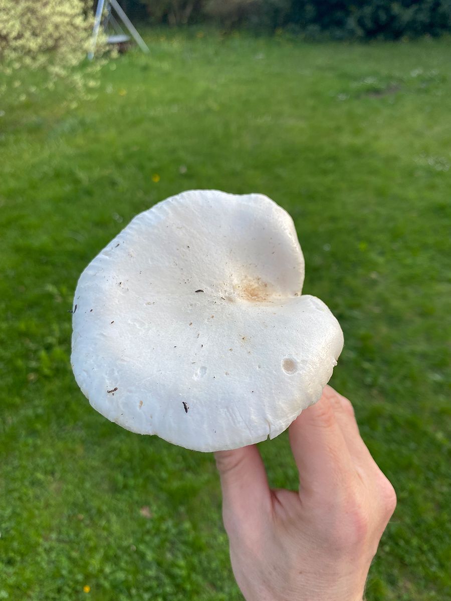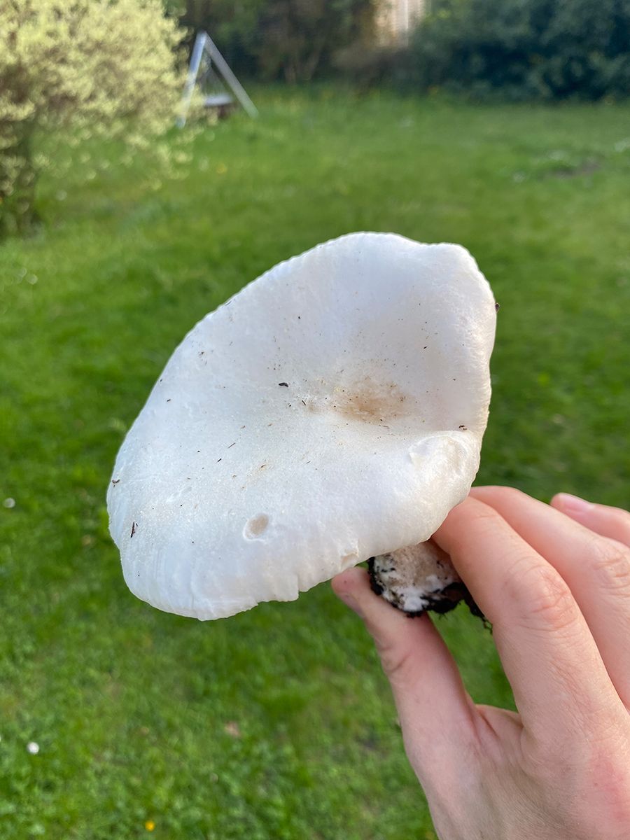 Ich habe gestern (9.5.2022) bei meinem Nachbarn im Blumentopf mit Minze folgenden Pilz gefunden. Ich hatte kurz gehofft, es sei mein erster Maipilzfund, das scheint er aber nicht zu sein. Was ist es aber dann?
