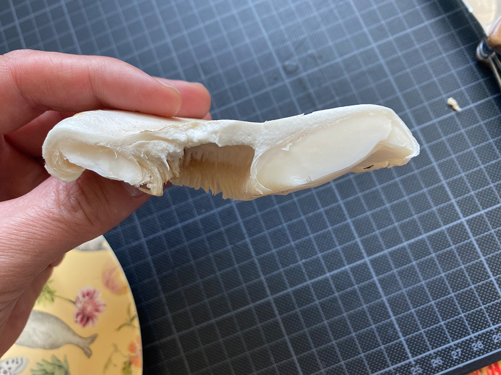 - Stiel weiß mit streifiger Natterung | ließ sich mit Mühe vom Hut entfernen | längsfaserig