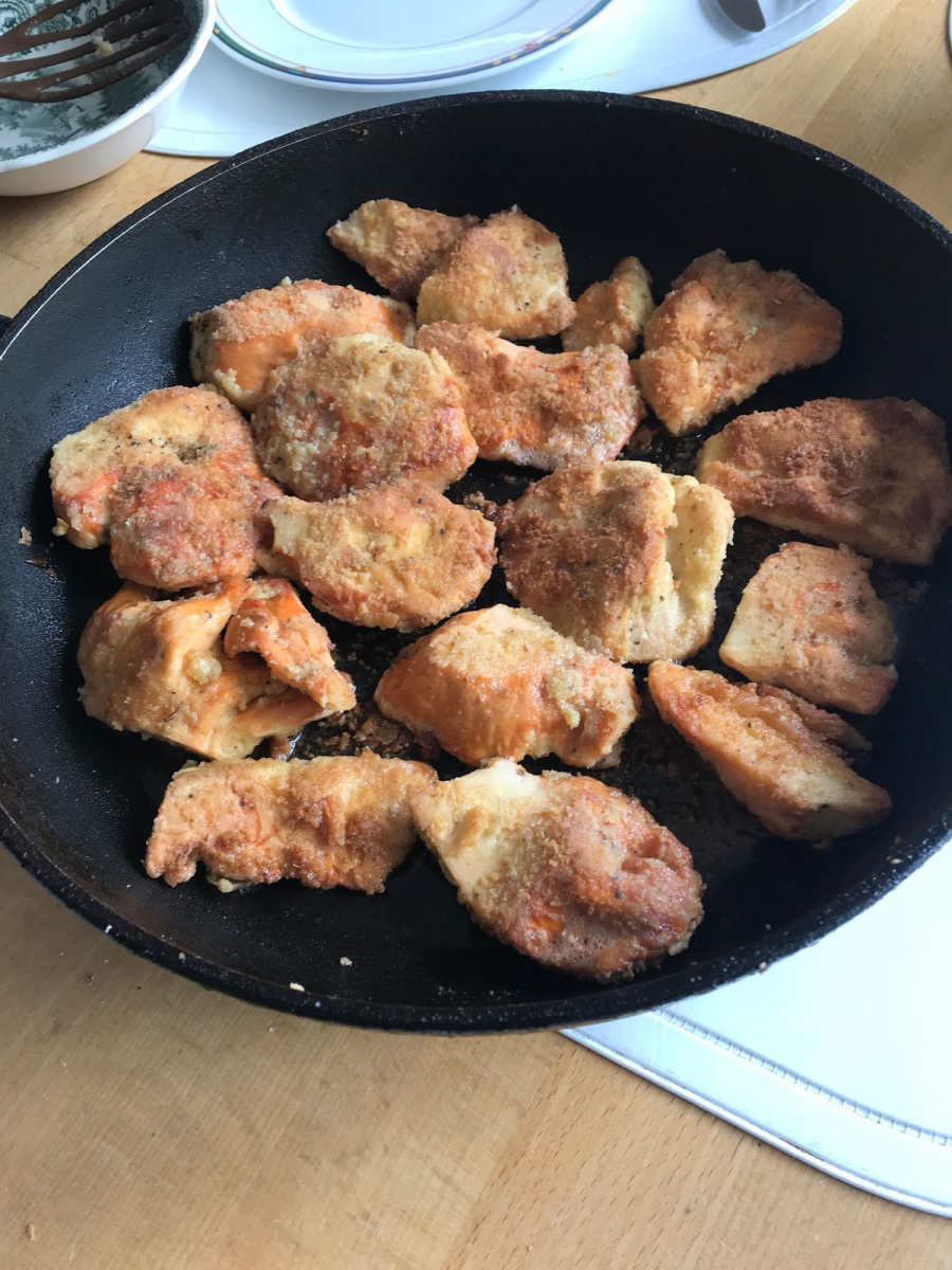 Heute haben wir Stücke geschnitten, gekocht und anschließend wie Hähnchennuggets paniert und gebraten.