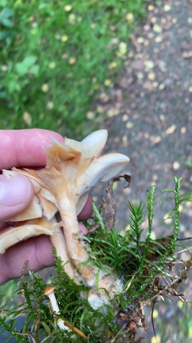 Die Pilze haben eine orange Farbe, teilweise sind die Hüte und der Stiel bläulich/grünlich. Die Stiele sind allesamt knackig und hohl, sie brachen beim Sammeln in der Erde ab. Die Schnittstellen am Stiel bluteten stark Orange, an den Lamellen auch, aber deutlich weniger als am Stiel. Meine Finger sind durch die Milch orange-ockerfarbig