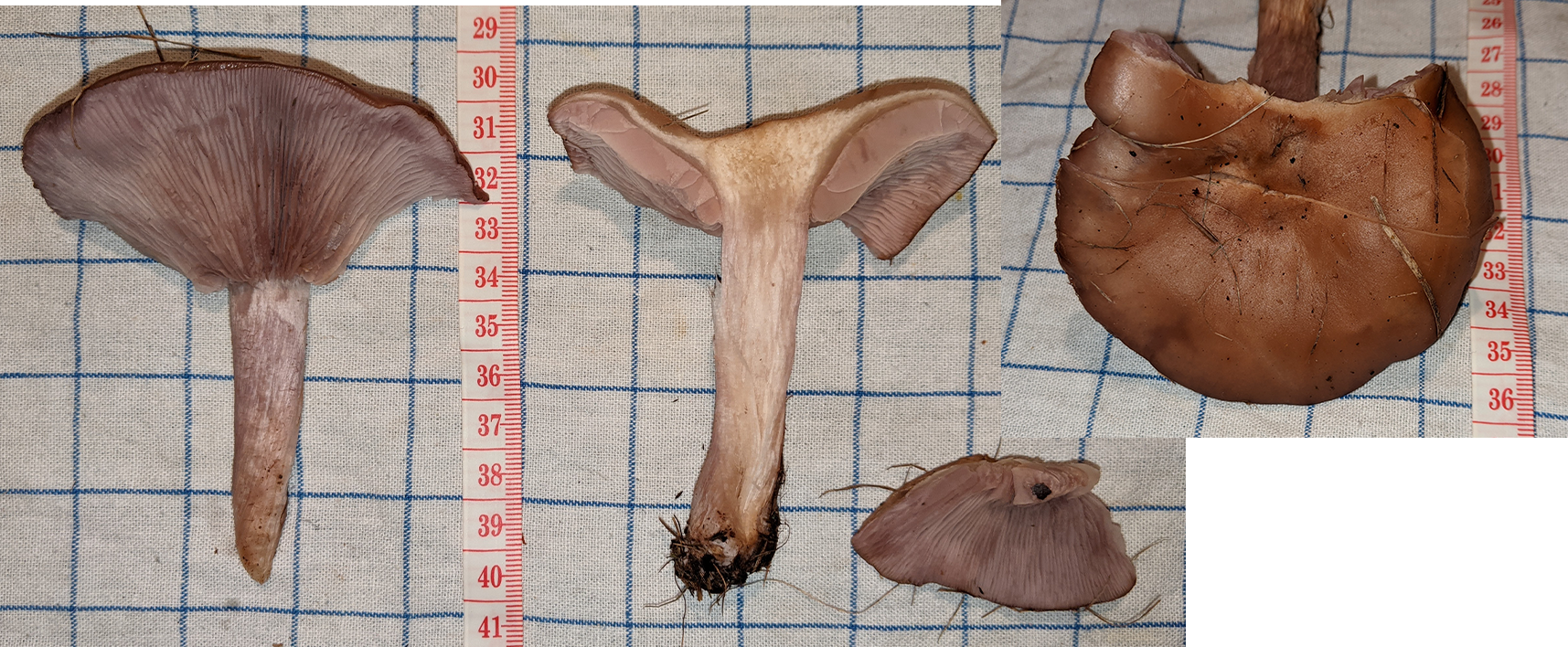 ^ 1. Die Kratzstelle am Stiel des linken Exemplares ist keine Minute alt, der Längsschnitt schon etwa eine Stunde her. Insgesamt, wenn auch durch den Zustand schlecht zu erkennen, ist/war der Stiel glatt und definitiv nicht genattert. Der Ring ließ sich verschieben. Gefunden am Übergang zwischen Fichten- und Buchenmischwald. Ich würde auf Safranschirmling tippen.