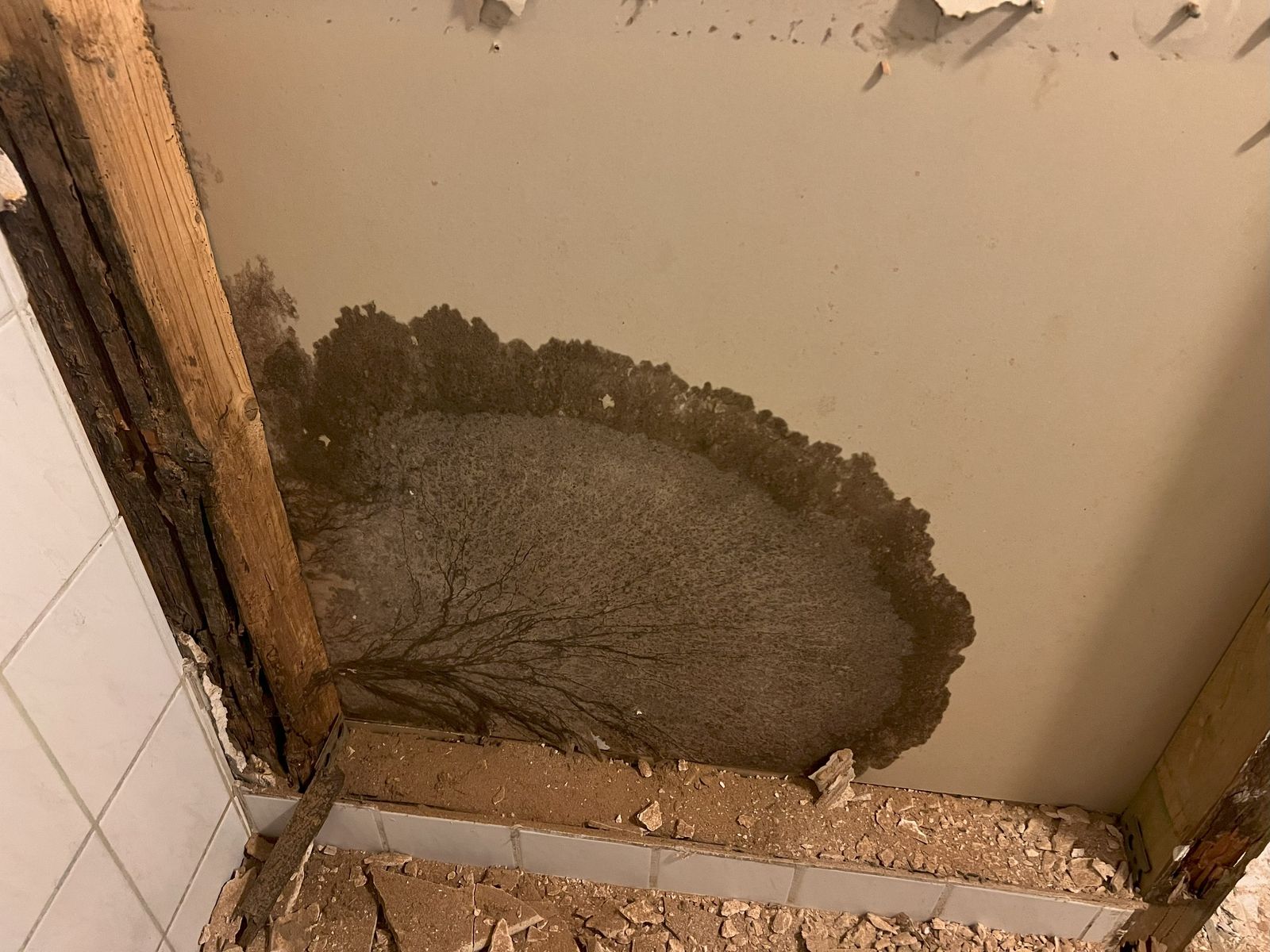 anbei ein Pilzbefall in einem Anbau.Es handelt sich um eine (dilletantische) Umrandung einer Dusche (Anbau, schlecht beheizt; kaum bewohnt). Es waren Löcher in den Fugen, so dass regelmäßig Feuchtigkeit zum Holz gelangen konnte.Das Holz war komplett zerbröselt (Braunfäule), kein Würfelbruch.