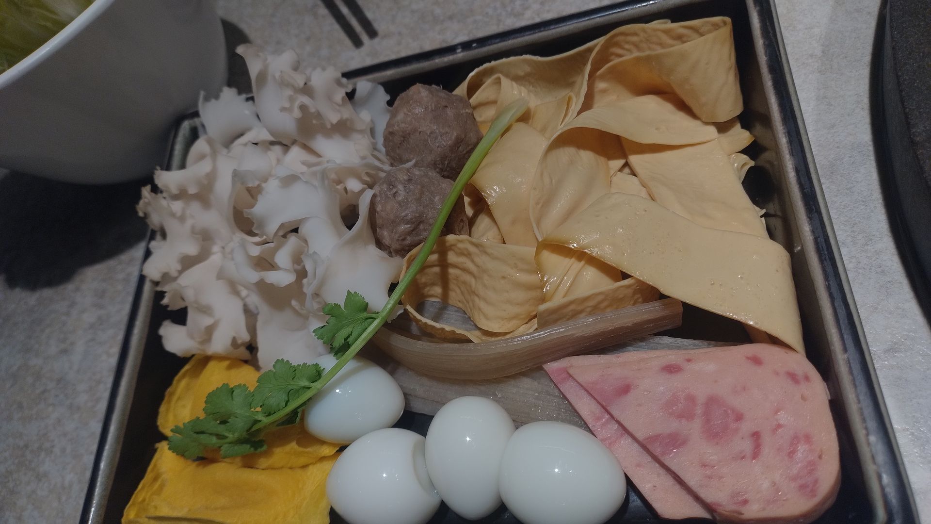 Ja das könnte eine Art Jagdwurst aus der Dose sein und Wachteleier. In Deutschland esse ich beides höchstens einmal in 10 Jahren . Das eine ist mir zu klein und beim anderen weiss ich selten was drinnen ist.