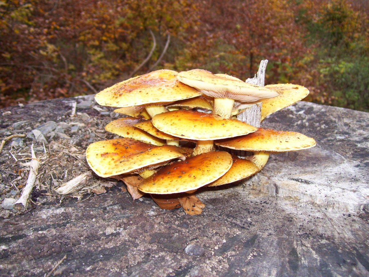 erstmal vielen Dank für Deine schnelle Antwort. Ob die Hutoberfläche schleimig war (wie z.B. bei einem Butterpilz) kann ich nicht mit sicherheit sagen. Ich habe den Pilz nicht angefasst. Beim entfernen eines Laubblattes zum Fotografieren ist mir jedoch aufgefallen, dass das Blatt relativ fest auf dem Pilz geklebt hat (schprich für schleimig). Zum Stiel kann ich gar nichts sagen. Der Hut der Pilze hatte schätzungsweise einen Durchmesser zwischen 6 und 7 cm. Das kommt in dem Bild nicht so besonders gut raus, da der Baumstumpf extrem groß war.