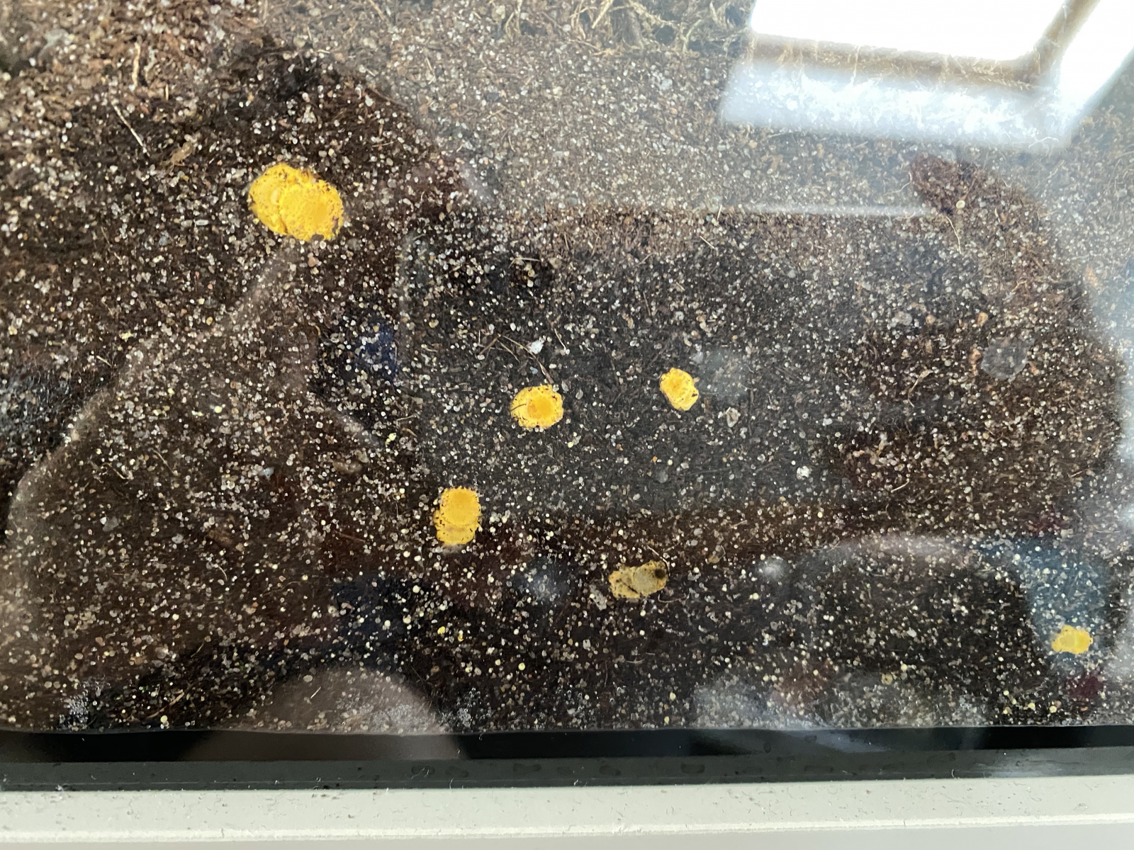 ich kann seit einigen Tagen/ Wochen gelb/orangene Punkte in der Erde meines Terrariums wahrnehmen, welche sich zu Pilzen entwickeln.