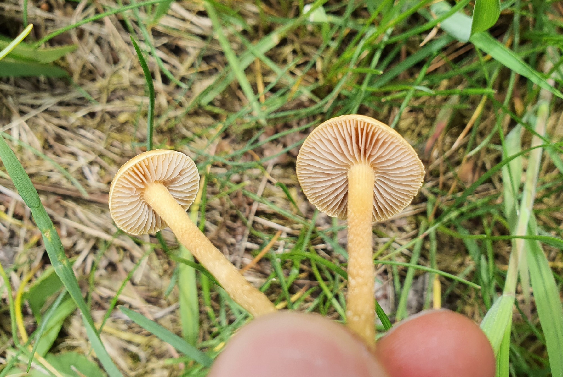2. Wieder auf einer Wiese gefunden. Das schwarze Sporenpulver und die (für mich) nestreifen Lamellen sprechen für einen Düngerling. Dazu gibt es einen hohlen Stiel und einen glatten/hygrophanen/nicht ausbleichenden Hut. Optisch kommt der Heudüngerling in Frage. Allerdings ist der Stiel hier nicht braun, sondern hell...