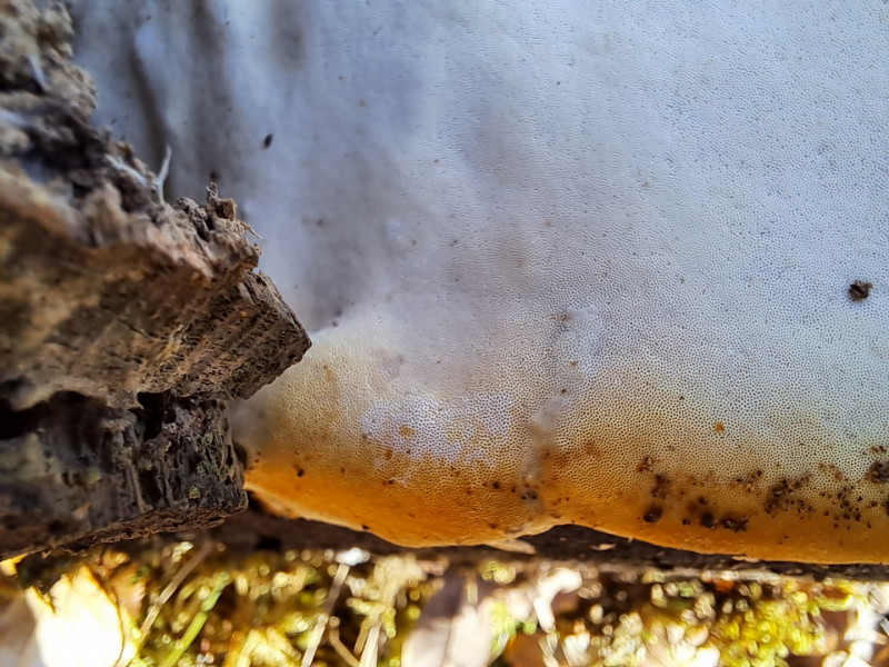 Rhizomorphen unterm Subikulum auf Unterseite des Frkps. gut ersichtlich, verzweigt, starr dunkelbraun-schwarz.