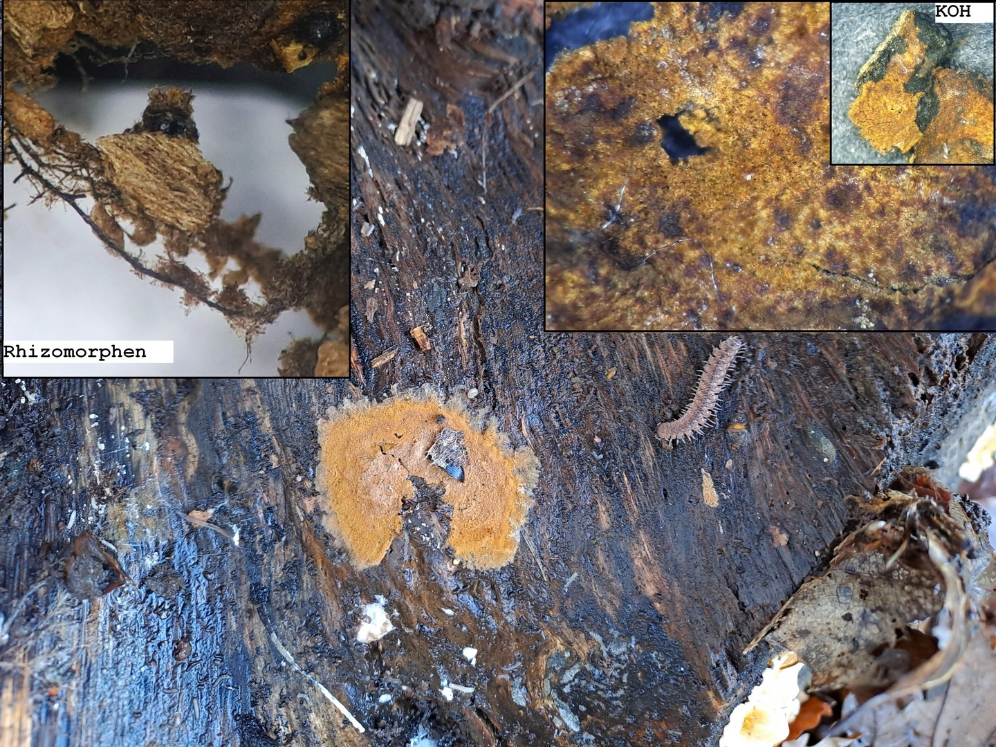Warzige 2-3 lappige Sporen, Präparat gelbgrün in KOH, Rhizomorphen mit Skeletthyphen.