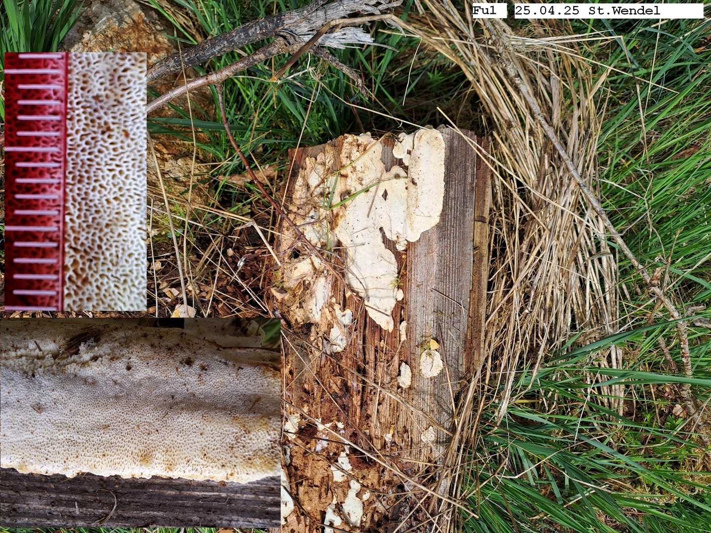 Frkp. weißcreme-gelb > gilbend, dünn, resupinat, feinporig (2-4/mm), weich. Er ließ sich z.T. großflächig, wie gummiartig, leicht vom Substrat ablösen. Die Porenränder sind z.T. steril weiß fransig-wattig. Auffallend war sein unangenehmer säuerlicher Geruch.