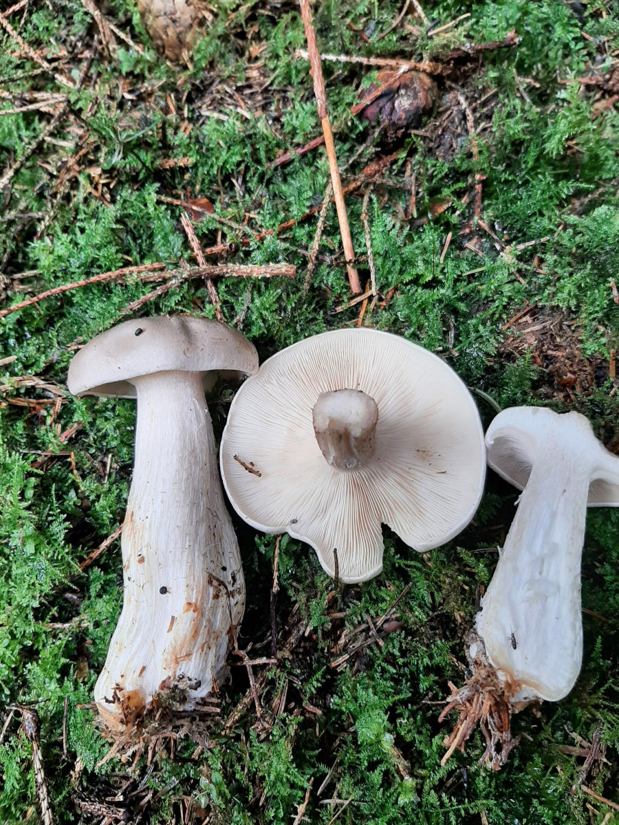 Wächst unter Fichte, Geruch angenehm pilzig irgendwie. Kann keine bräunliche Punktierung am Stiel ausmachen und knollig verdickt sieht das für mich auch nicht aus. Der Stiel scheint eher verdreht zu sein.