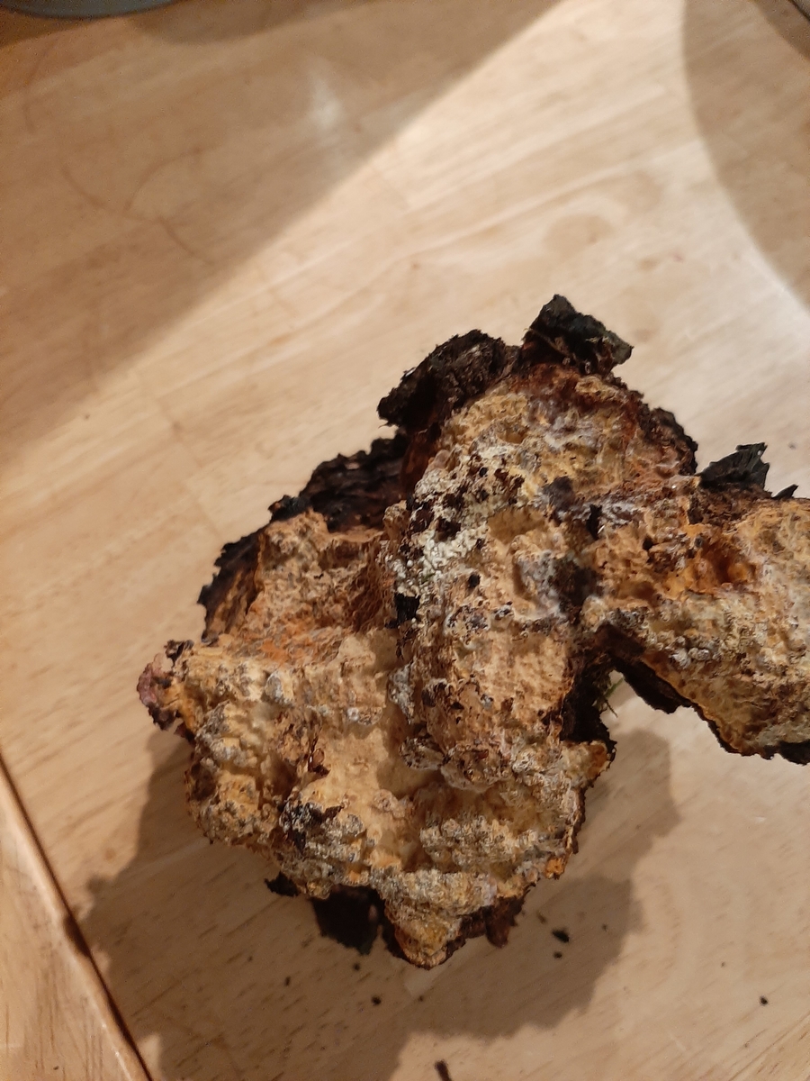 Habe selbst inzwischen schon sehr viele Chaga geerntet (Natürlich ausschließlich von lebenden Birken). Die meisten davon wie gewohnt korkig-braun mit spuren von Myzel, aber einige wiesen im Inneren eben genau diese weiße Substanz auf, mal mehr und mal weniger. Gehe einfach mal stark davon aus, dass dies kein Schimmel ist. Vielmehr würde ich da auf einen Stoff namens BETULIN, den weißen Farbstoff in der Birkenrinde tippen. Möglicherweise schließt der Chaga manchmal, je nach Wuchsform, einen Teil dieser Betulin-Schicht ein, anstatt durch sie hindurch zu wachsen.