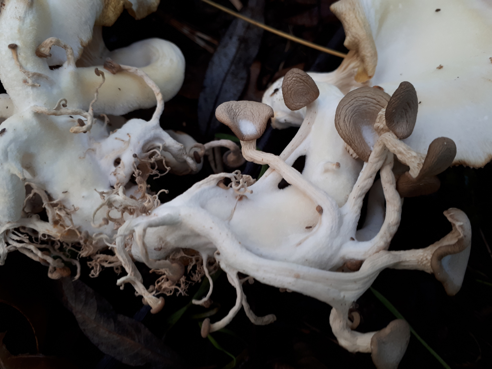 Der Pilz hat seine Sporen schon abgelegt. Diese sind weiß, und überall in dem knapp 3 qm großen Raum verteilt (vor allem um den Pilz ist eine dicke weiße Schicht, aber auch zB Spinnenweben sind davon bedeckt).