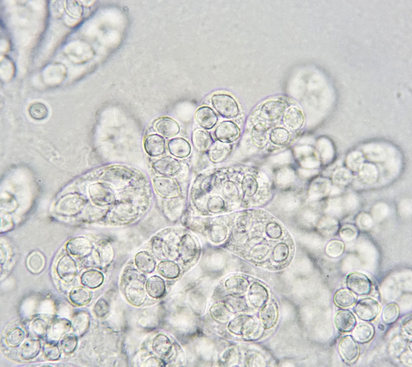 die Beschreibungen der Merkmale sind ja recht mager! Welche Größe haben denn die Fruchtkörper, das Pedicel, die Anhängsel, die Asci? Die Sporen auf deinen Bilder weisen ja recht unterschiedliche Größen auf. Welche hast du denn gemessen, die großen, die kleinen oder hast du den Durchschnitt genommen? Versuch mal noch ein Bild von den Tuberkeln und von angefärbten Sporen mit Anhängseln zu machen. Eine Idee hätte ich ja, aber die wäre momentan nur mehr oder weniger geraten!
