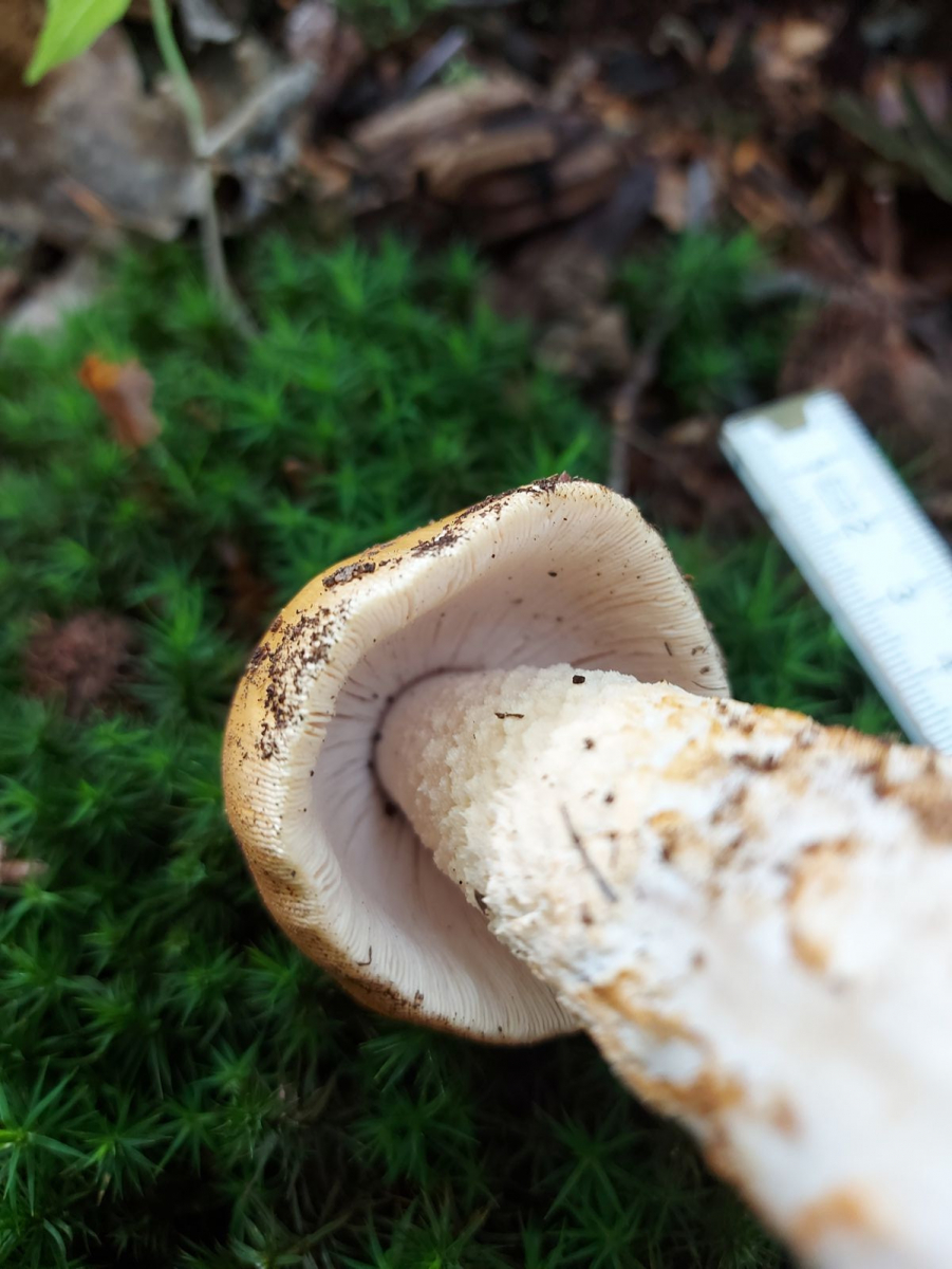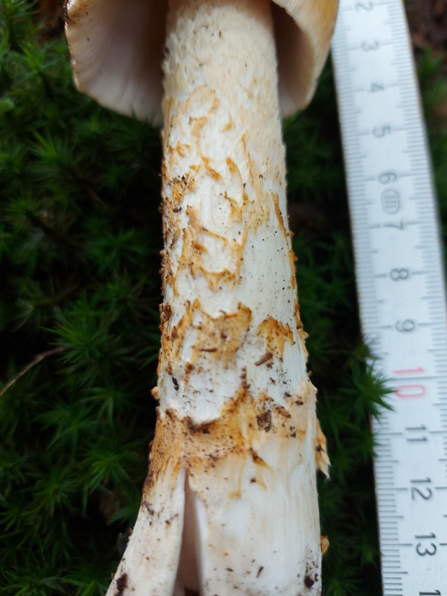 Der Pilz wurde am Stiel hach unten immer schuppiger und die Schuppen waren außen braun.