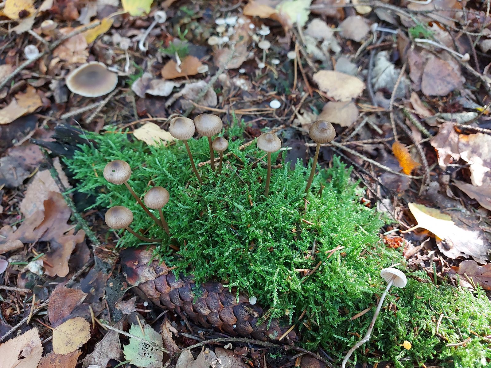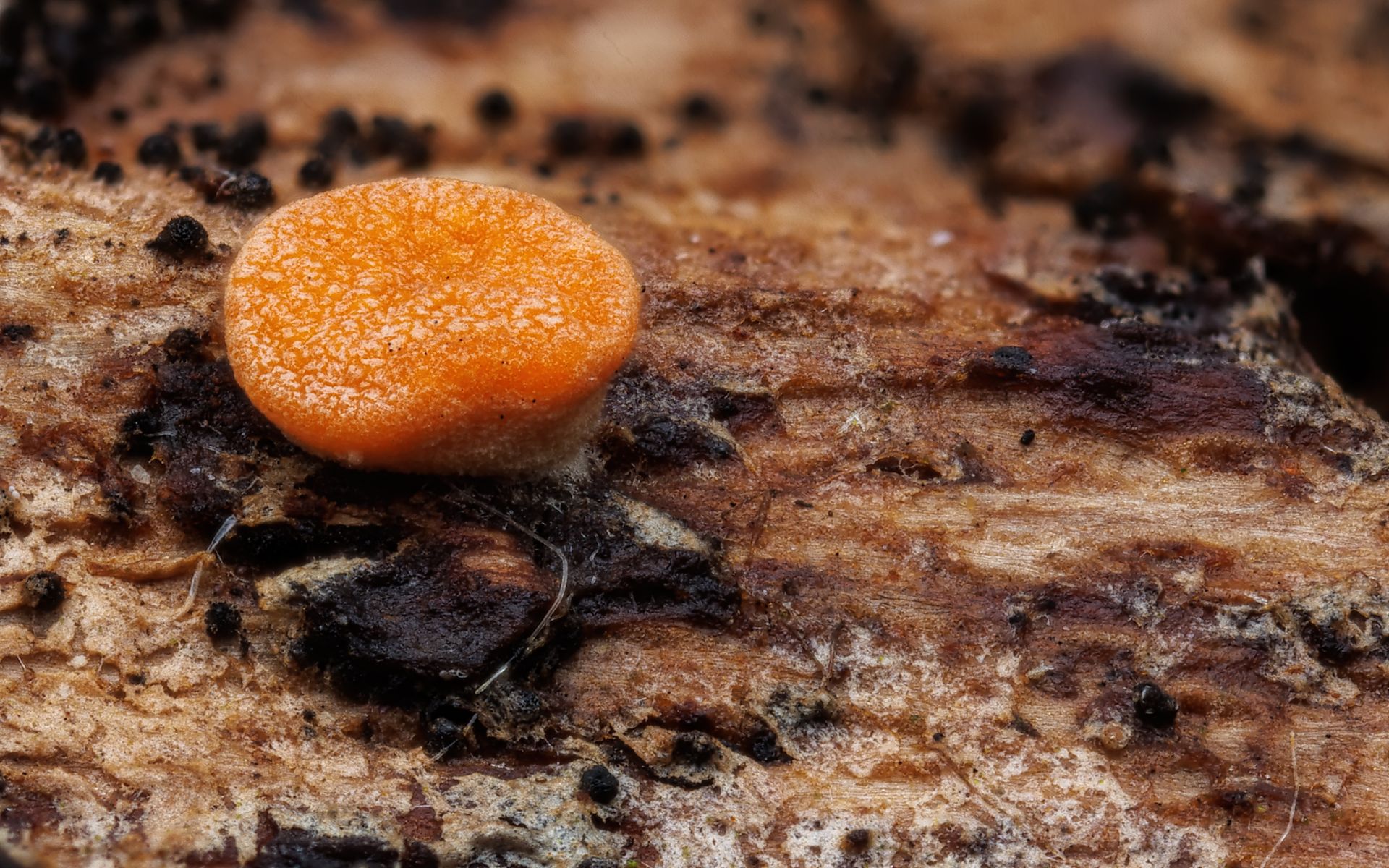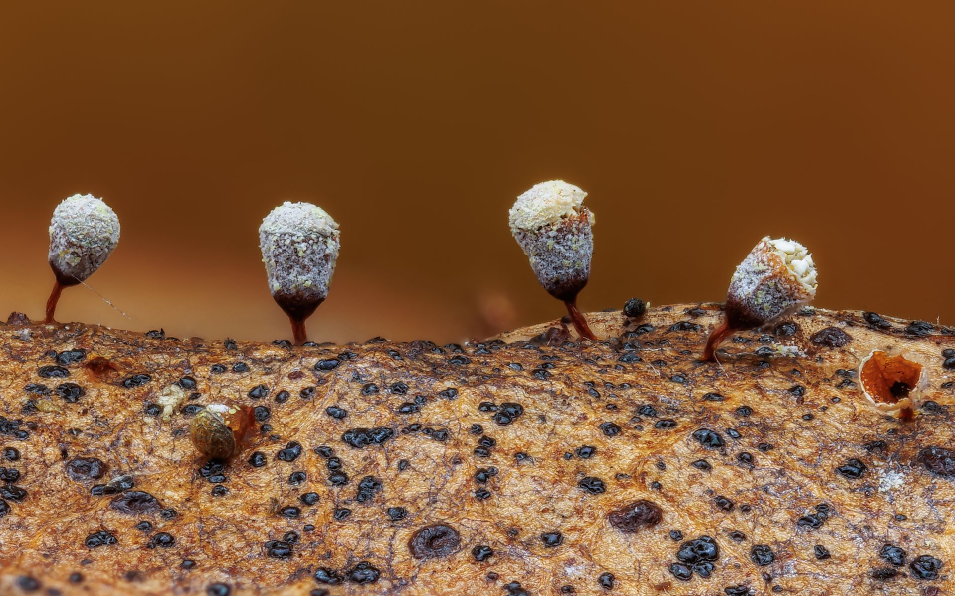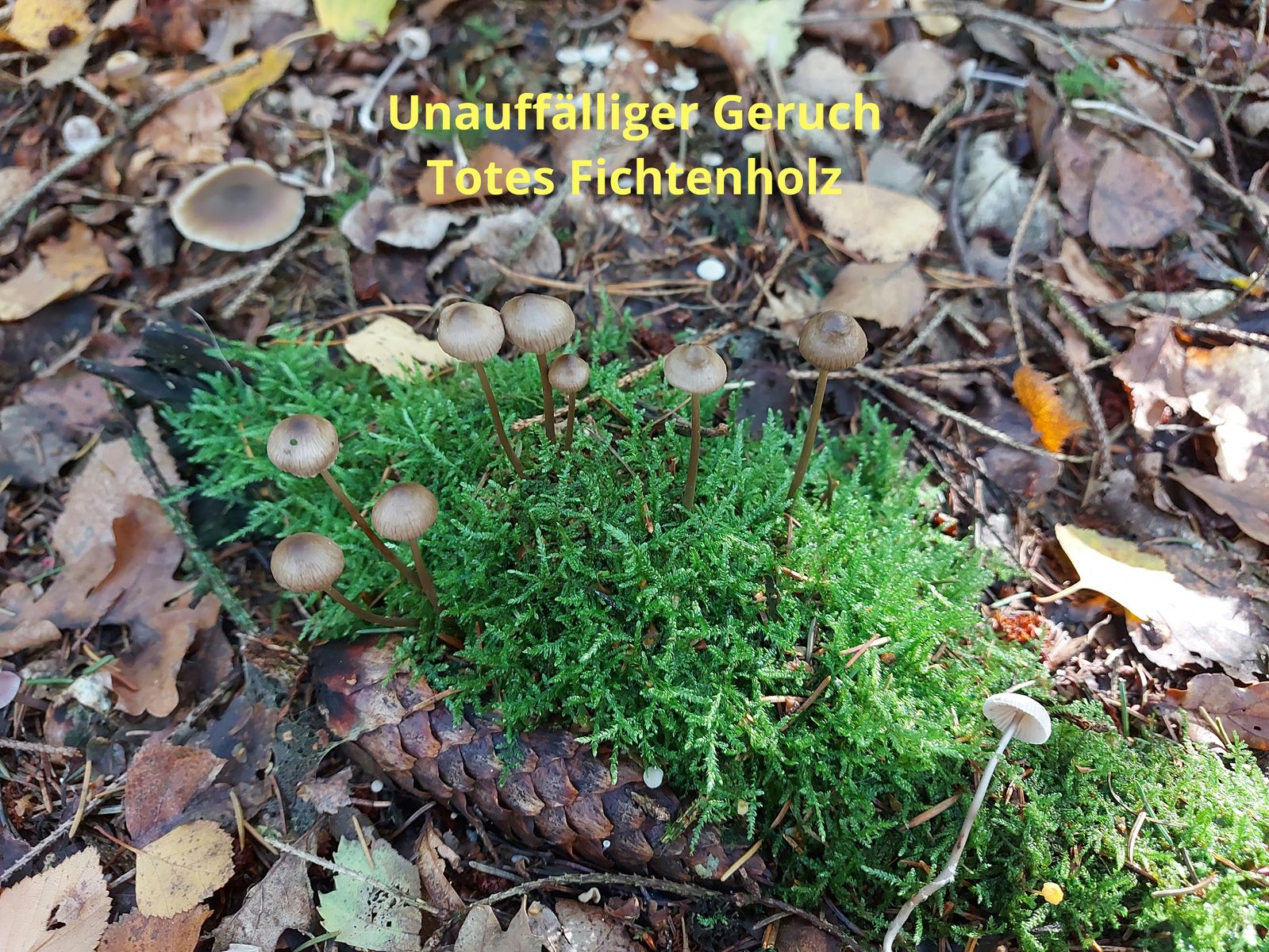 Die Pilze waren in kleinen Gruppen angeordnet und zwischen 1-3mm groß. Die Bildvergrößerung bei der Aufnahme beträgt 5:1.