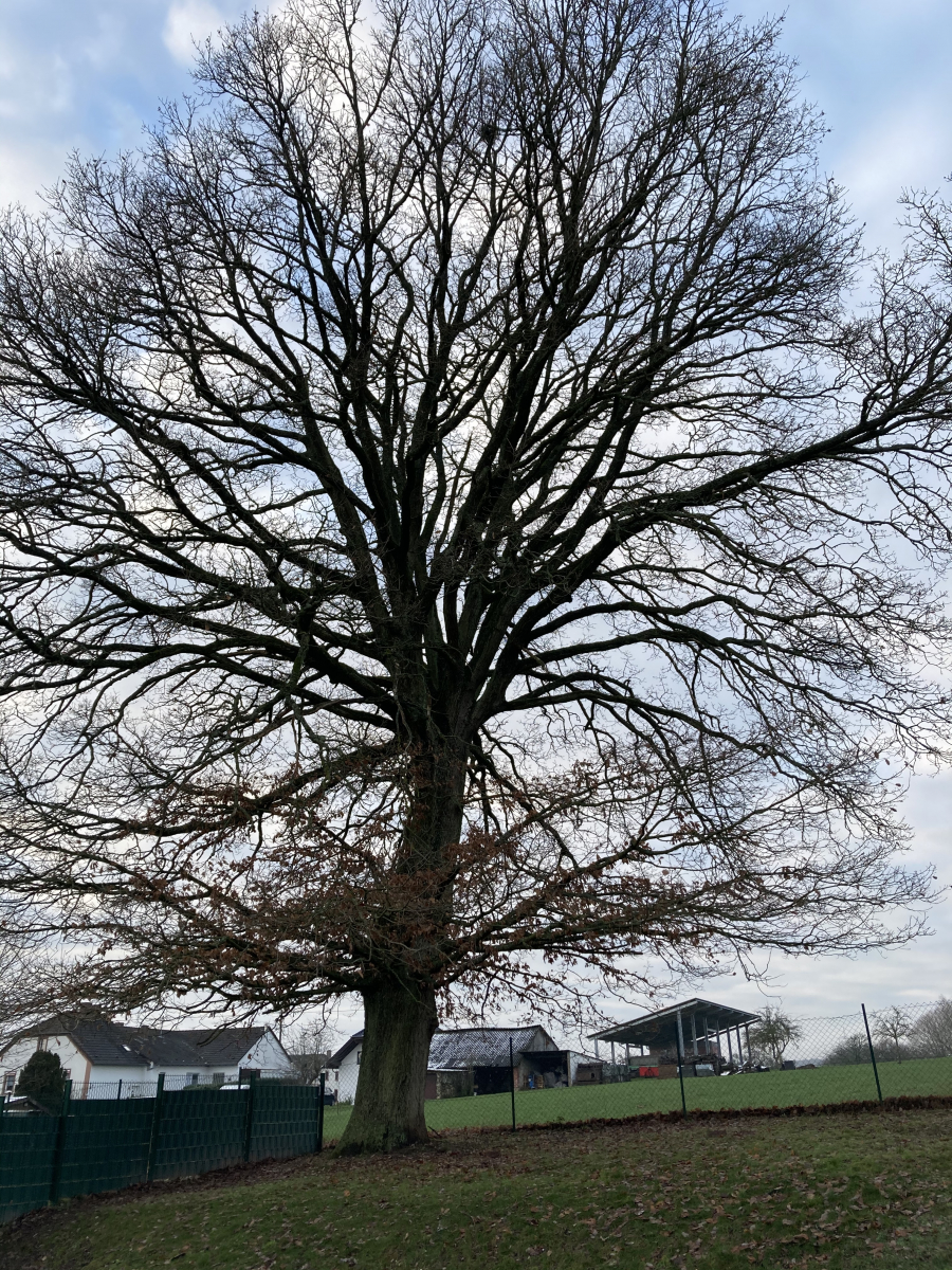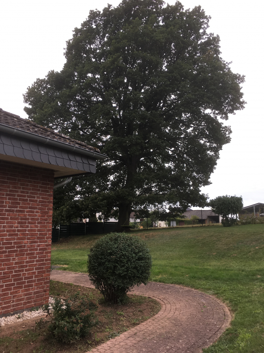 Ich habe der Voreigentümerin versprochen, dass ich mich um die Eiche kümmern werde und hoffe, dass ich von ihr noch einiges zum Alter oder der erwähnten abgebrochenen Spitze erfahren kann. Ansonsten werde ich wie angesprochen versuchen alte Karten und Fotos auszuwerten.