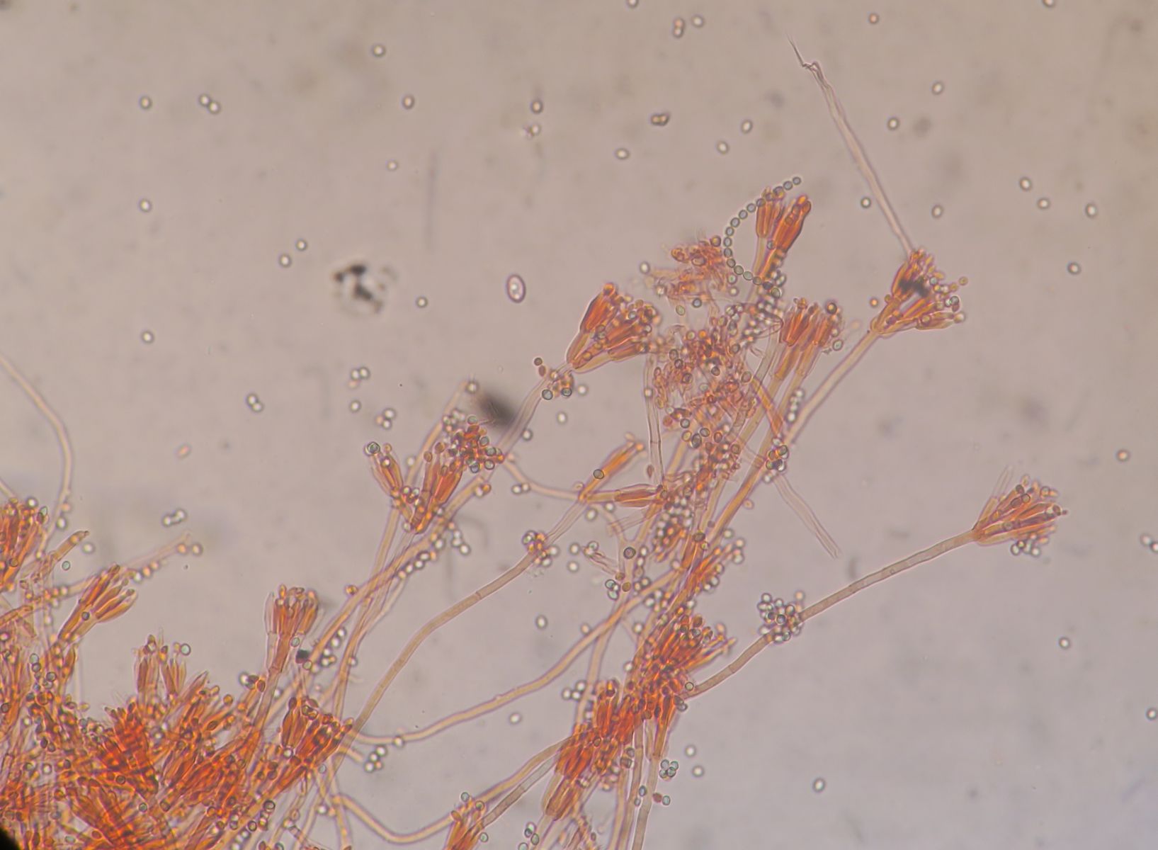 So here we have a situation of buy one and get one free. I cultured the microfungus by touching the infected fruits on petri dishes, and what we have: two microfungi - The Erysiphe with many white unornamented Chasmotheca intermixed with an Aspergillus species forming beautiful cyan / sky blue conidiophores.