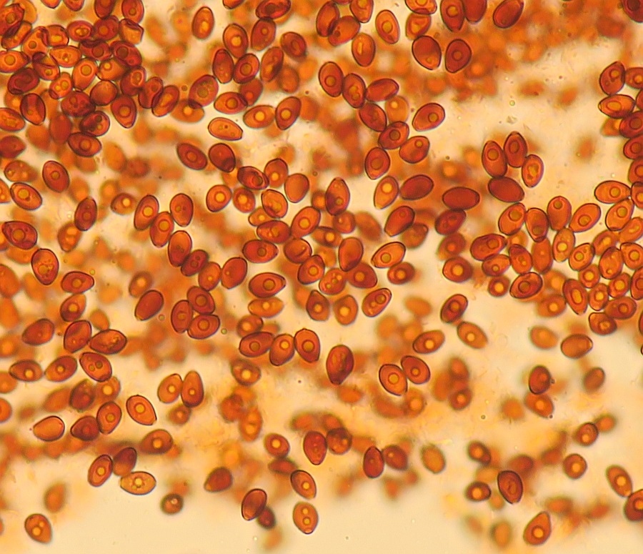 These photos are from an old collection and I don't remember much about it, or if I have a specimen, but this photo shows clearly spores in the range of 8.5-9.5um length and pleuro- (or cheilo-) cystidia that are broad and short. I hope there weren't two or more specimens of different species close to each other and have a mixture. The substrate was annual herbaceous plants (maybe grasses?) that dried out in summer and then this fungus grew after the autumn rain.