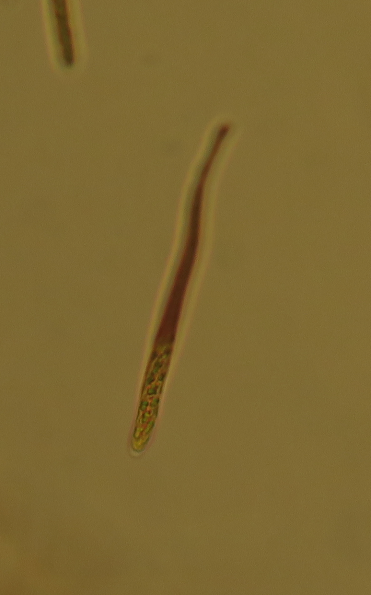 The asci are dextrinoid or stain strongly in IKI except where there are the spores , otherwise inamyloid at the tips; 60-80um long and only 5 um wide. The elongated spores overlap each other in the ascus. The spores are interesting and maybe do not corresponding with C. citrina. They are narrowly fusiform, almost linear with four bands due to the presence of four evenly spaced guttulae. They measuring roughly 10-14 µm x 2-3 µm. They do not stain well in Congo red or IKI. I believe there is a central septum.