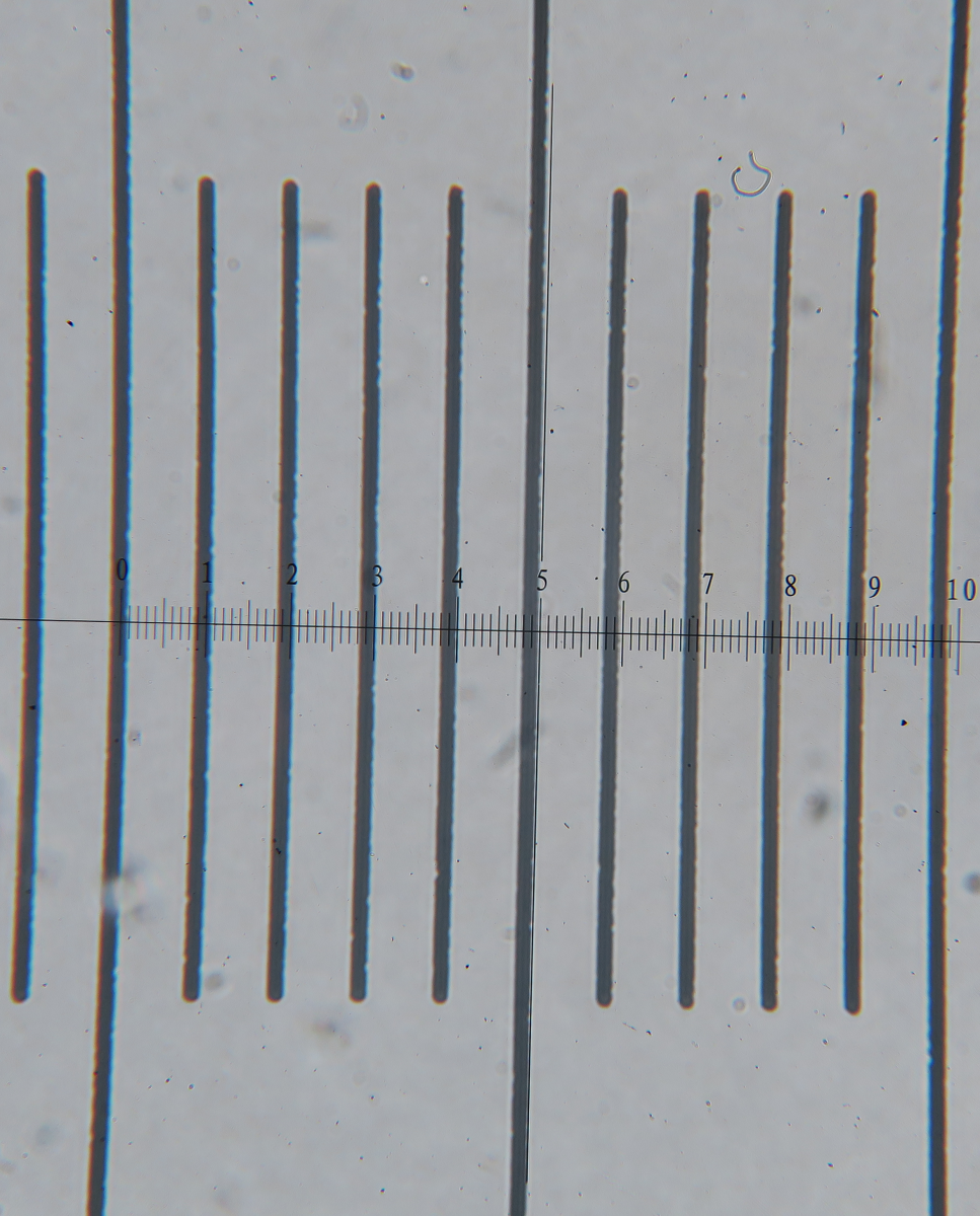 Let me write about the procedure, just in case... I mount the stage micrometer which has a very thin and small circular coverslip fixed to the glass slide, transfer a small drop of oil over its surface, mount, and bring to focus the scale. Then I place the reticule eyepiece (I have 3 of them) and align it so the zero marking is over the end of the stage marking. I count how many reticule markings make a known measurement and calibrate accordingly