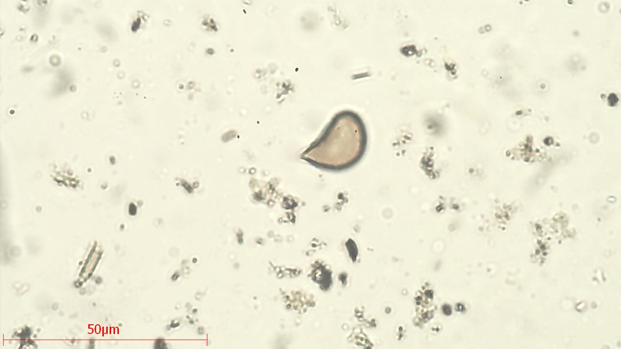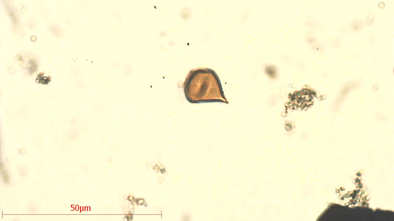 Diese Spore sieht tatsächlich immer so aus, tropfenförmig. Ich habe leider keine Ahnung und außer der Spore mit Größe auch keine weiteren Infos.