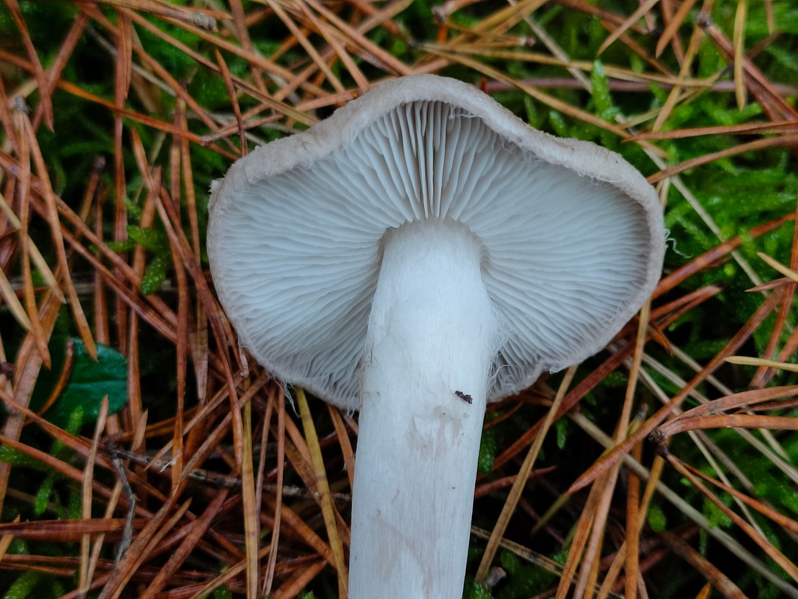 10. Noch ein einzelner Torfmoos zu stehender Entomola mit einer ebenfalls feinsamtigen radialen weißen Hutstruktur. Die Lammellen sind leicht weisslich gecheckt.