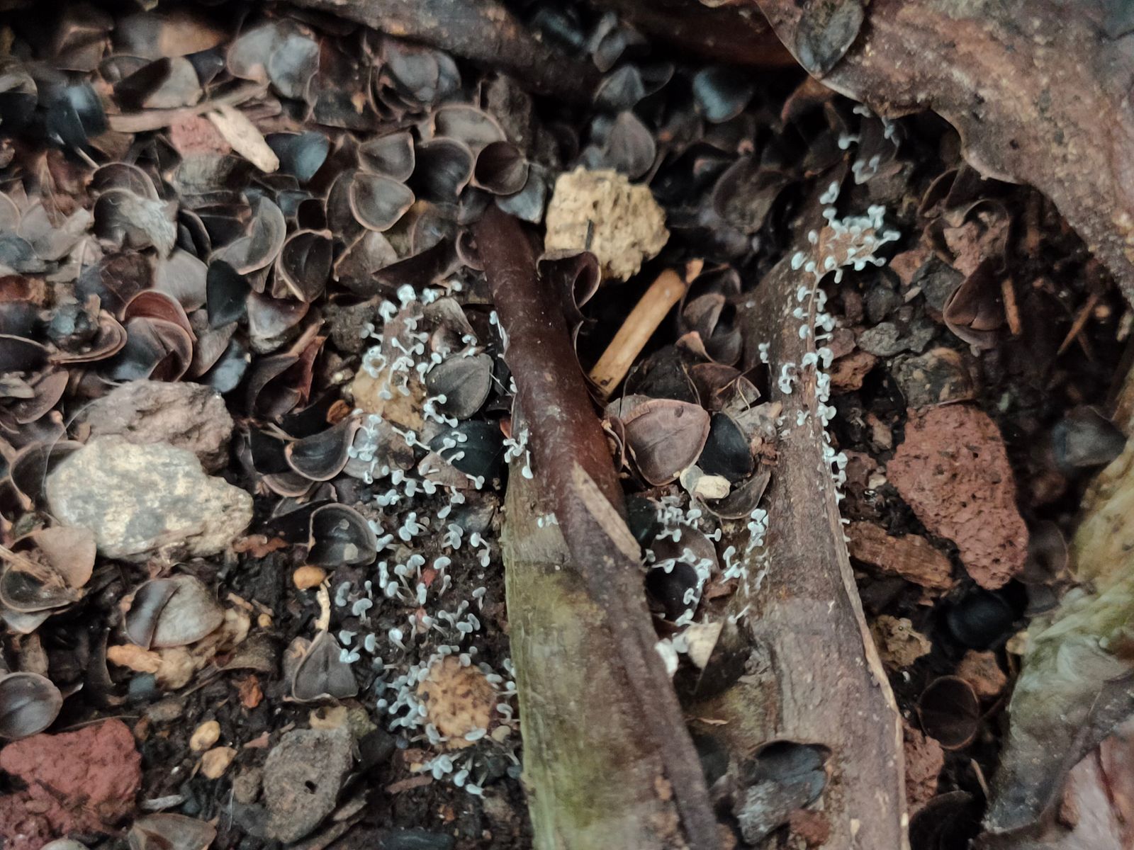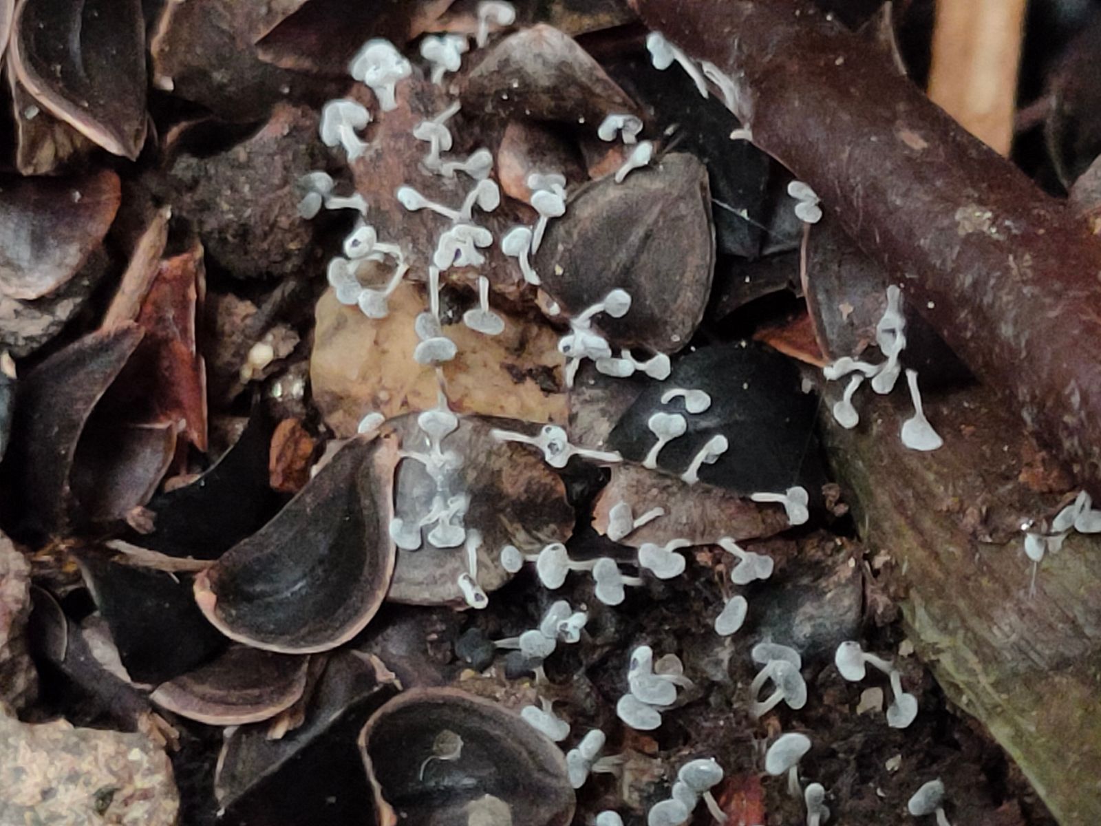 7. Ein Gruppe roter Täublinge mit einer Buche in der Nähe. Leider wurde die Gruppe schon ordentlich angefressen. Mit dieser Hutfarbe und weissen Lamellen.