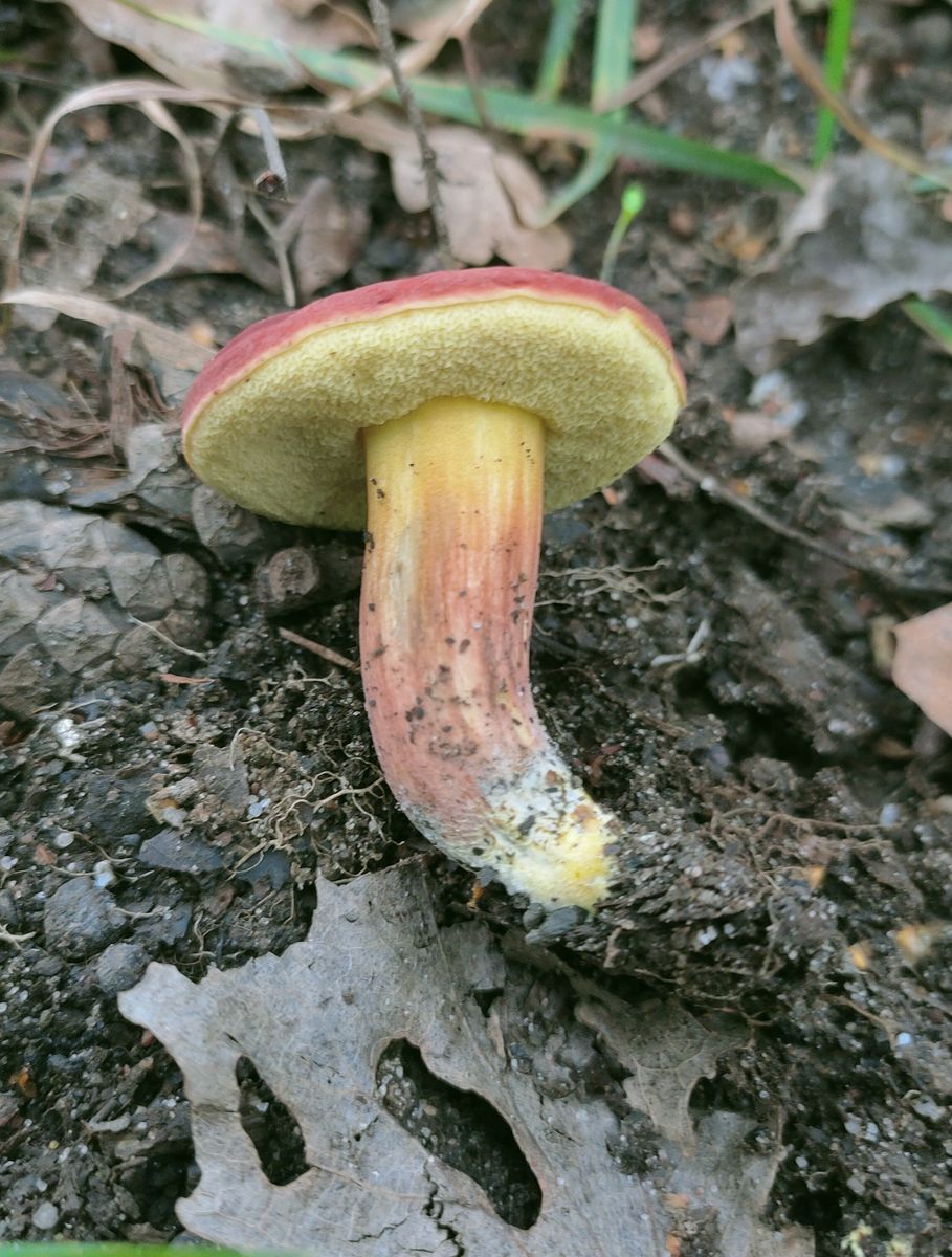 Der Röhrling hat einen rötlichen nicht schierigen Hut. Die Röhrenmündungen würde ich als Graubraun beschreiben. Diese läufen am Stiel