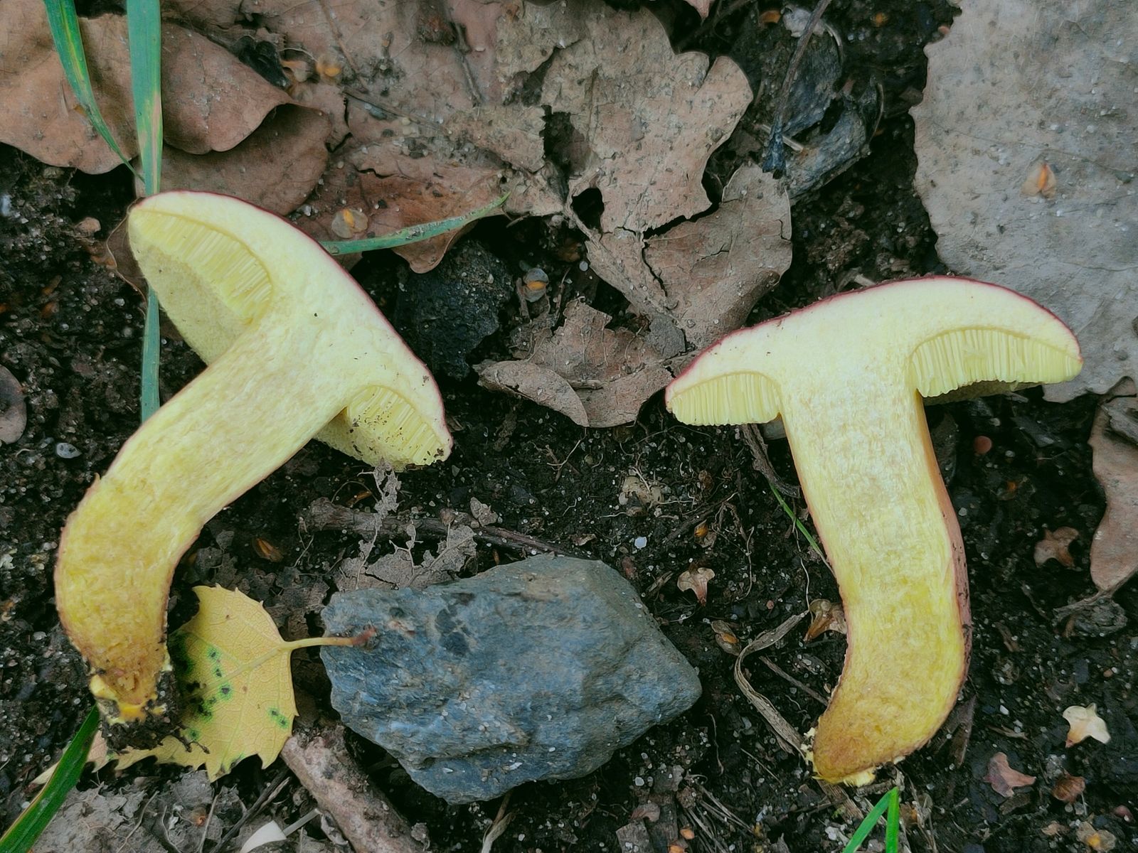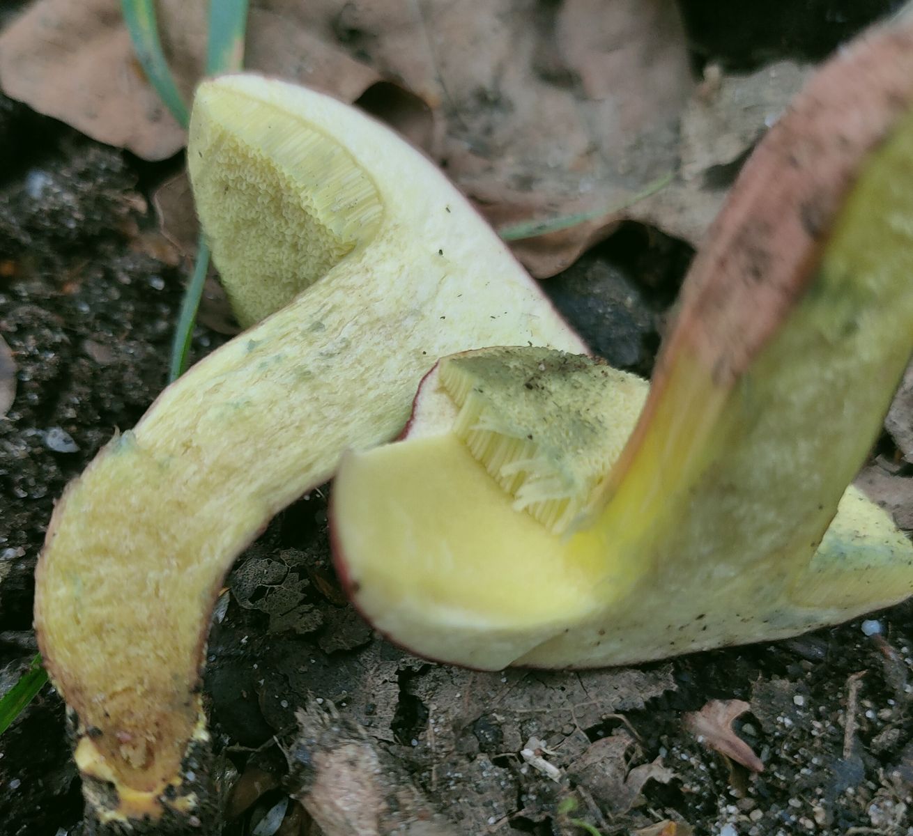 das Schnittbild unverwechselbar als Hortiboletus rubellus identifiziert. Im hellgelben Fleisch ist auch eine