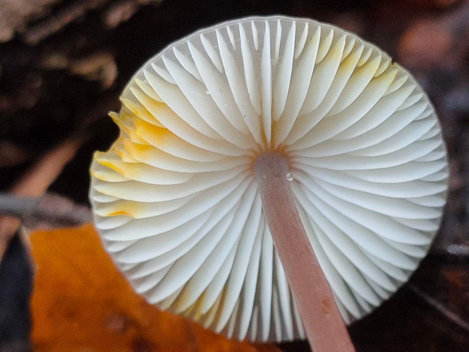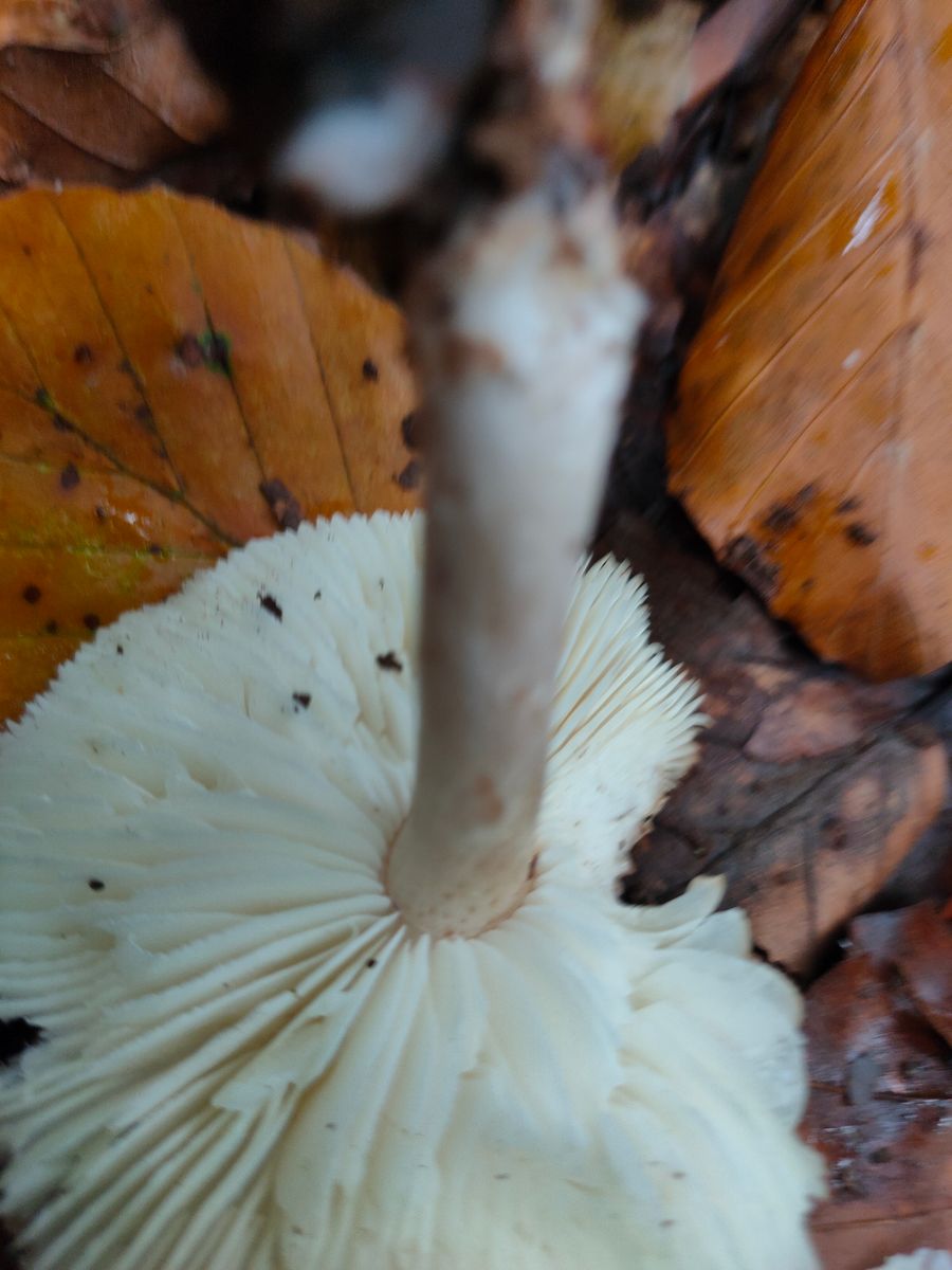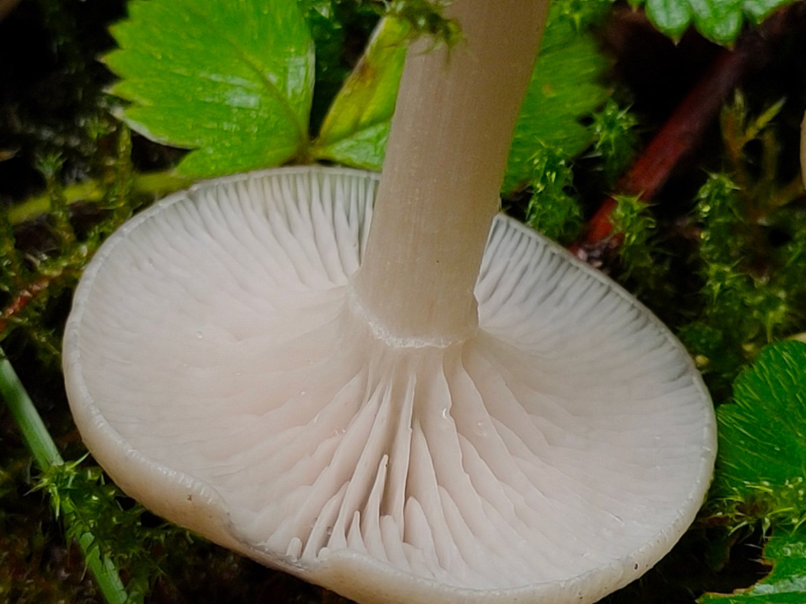 Die grauweissen Lamellen sind ausgebuchtet angewachsen und laufen mit Zahn am Stiel herunter.