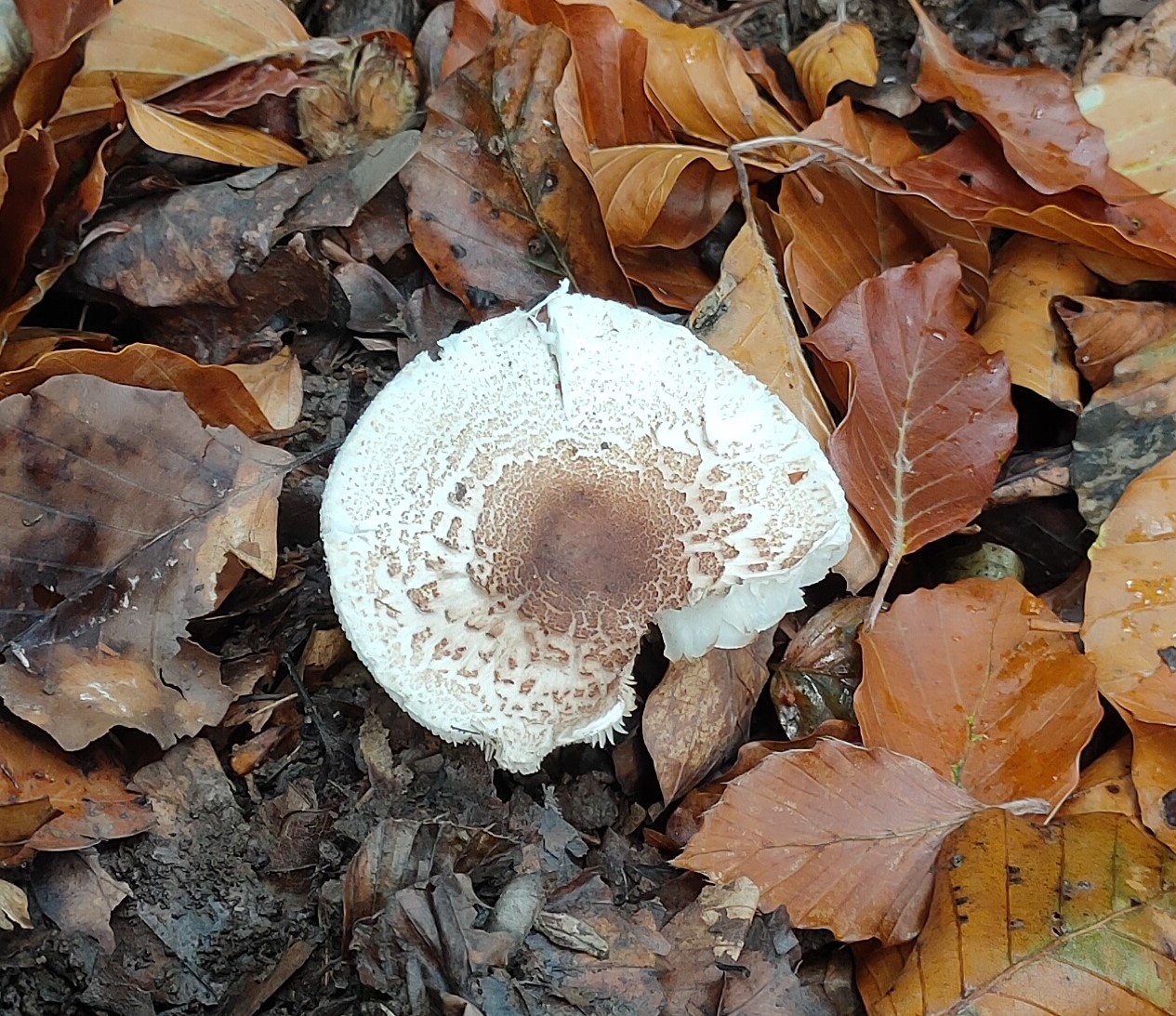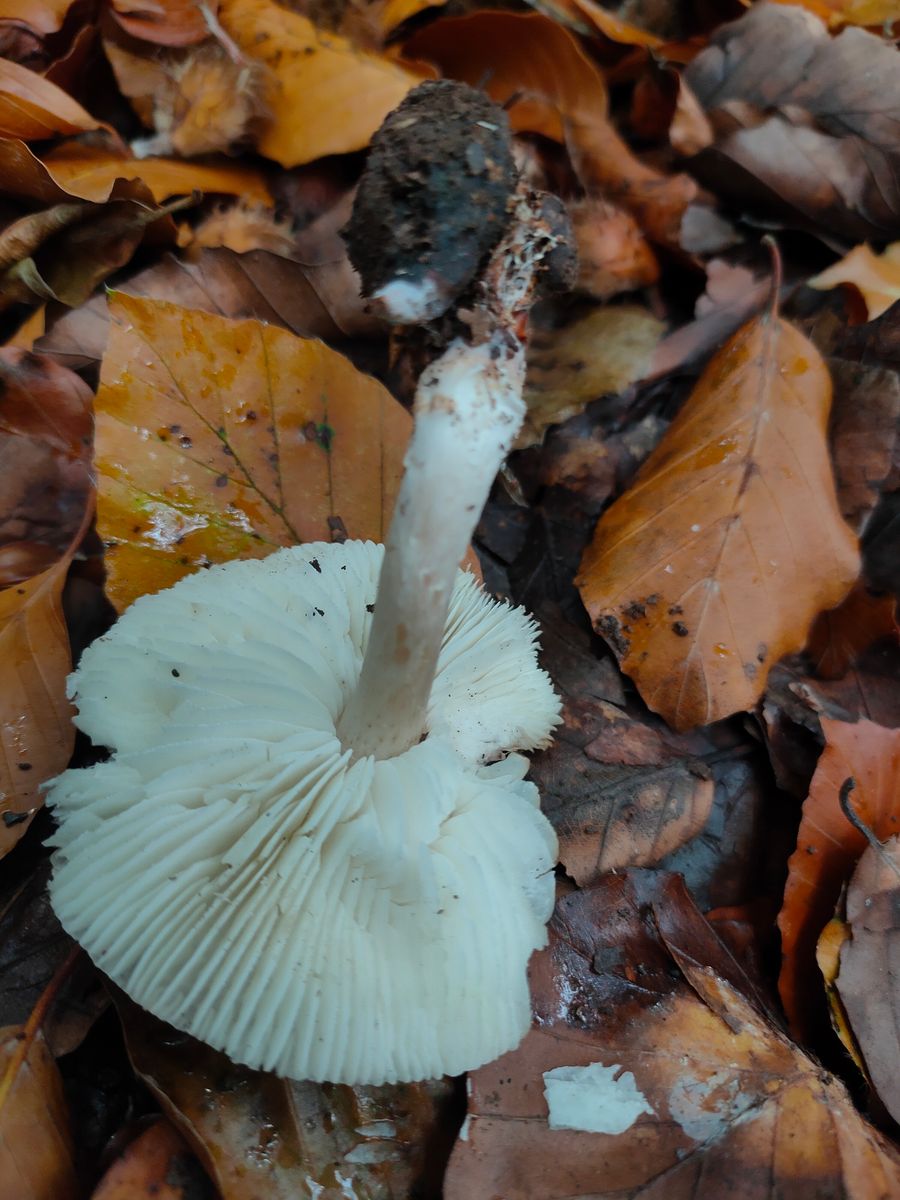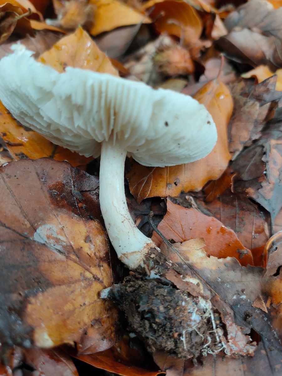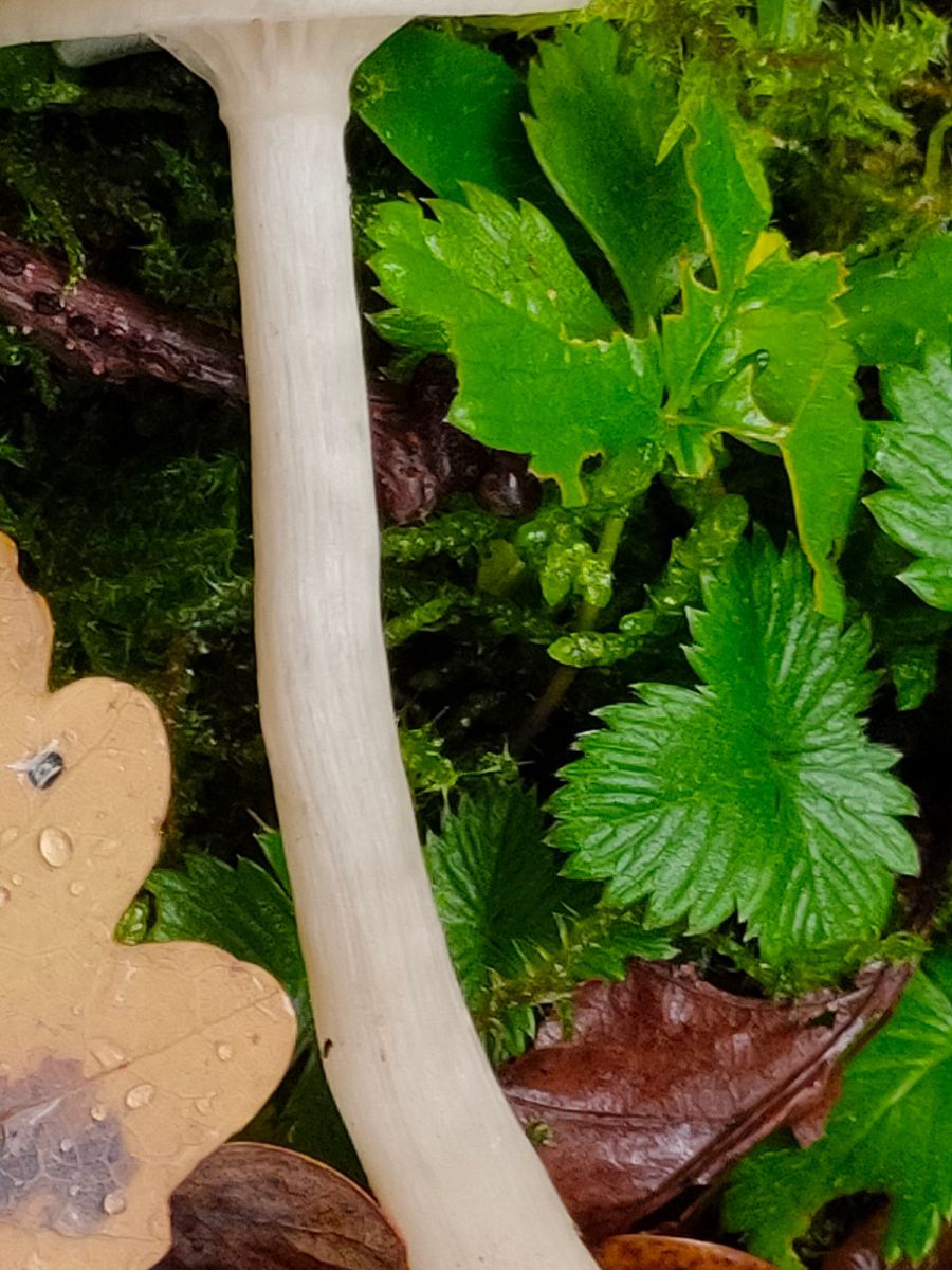 Der braune Stiel ist ebenfalls ausgesprochen weiss überfasert und zeigt Längsrillen. Ein Myzelrest ist für mich an der Stielbasis nicht zu erkennen.
